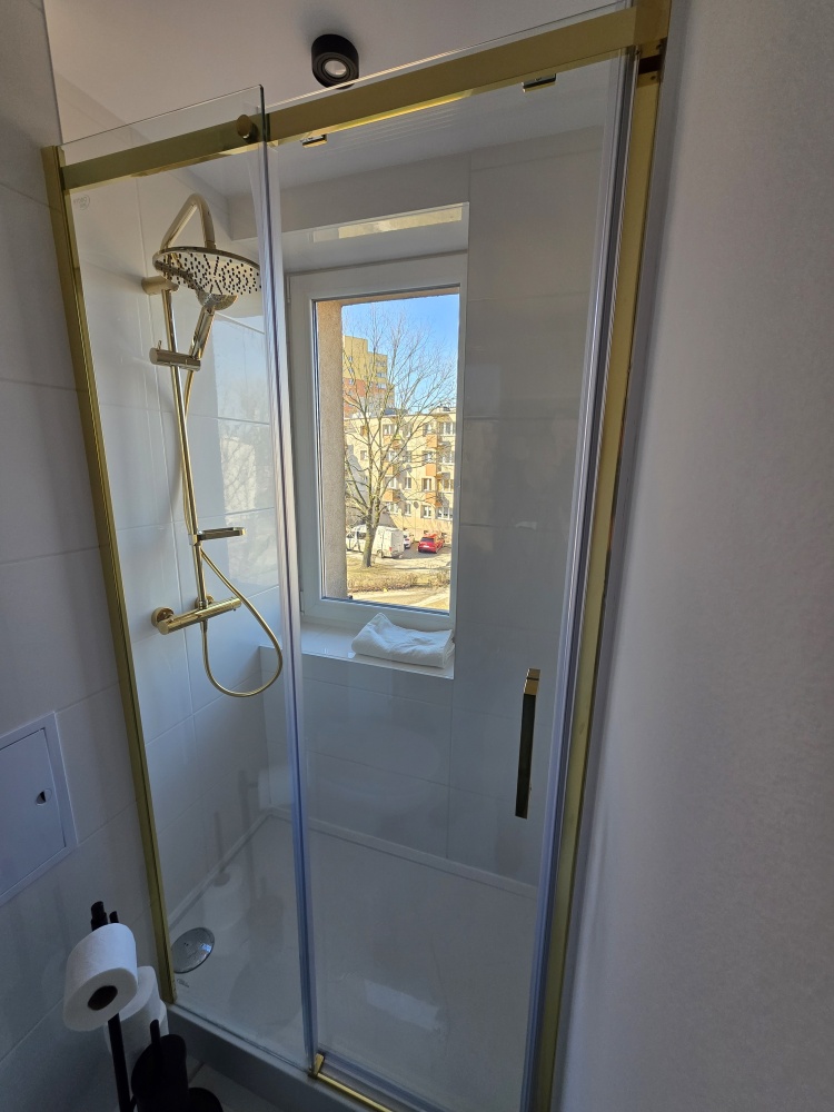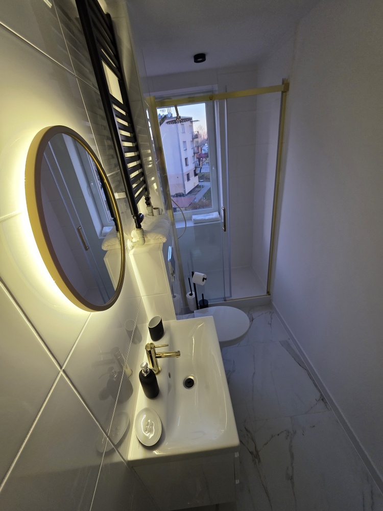 – łazienka: wykafelkowana, prysznic, umywalka z szafką i lustrem podświetlanym, armatura w kolorze złotym,