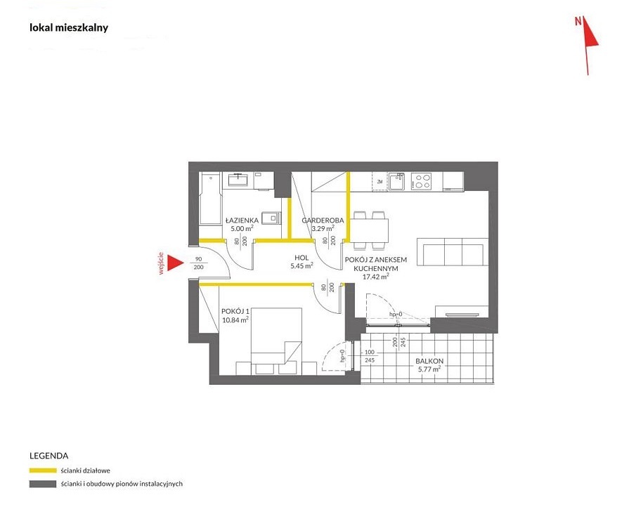 Powierzchnia salonu z aneksem kuchennym – 17,42 m²