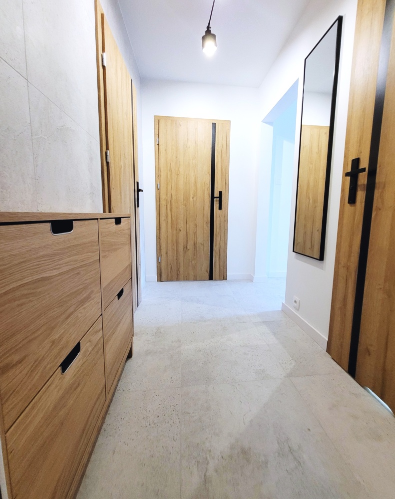 Mieszkanie przeszło kapitalny remont, w którym zastosowano wysokiej jakości materiały, podłogi gres i drewno.