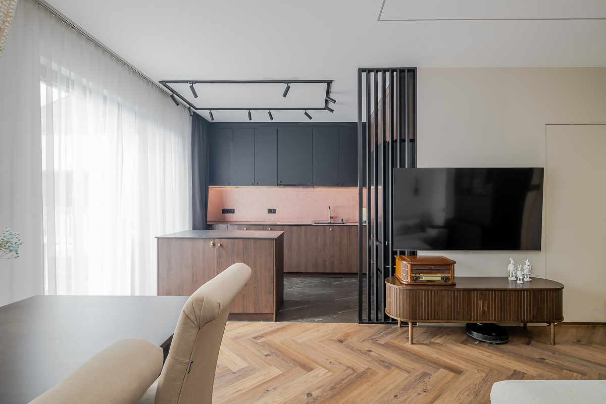 W salonie znajdują się również takie udogodnienia jak elektryczny karnisz, który obsłużymy zarówno pilotem jak i smartfonem. Rozwiązanie to umożliwi nam wyciemnienie pomieszczenia zasłonami black-out szytymi na zamówienie gwarantując 100% prywatności.