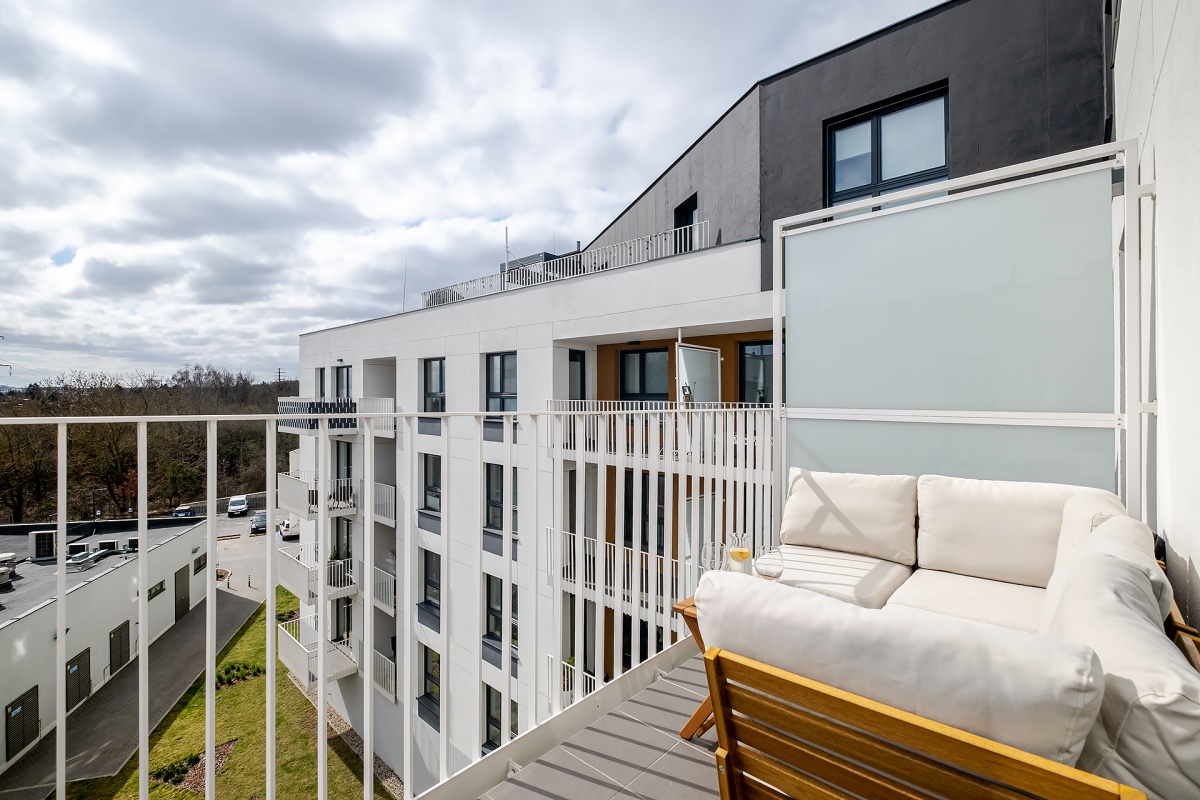 Z salonu poprzez całkowicie otwierane ogromne drzwi okienne wyjdaziemy na przestronny balkon, na którym znajdzie się miejsce na komfortowe meble ogrodowe. Dzięki ekspozycji południowej balkon jest słoneczny, co sprzyja relaksowi w słoneczne dni. Widok z balkonu na liczną zieleń.