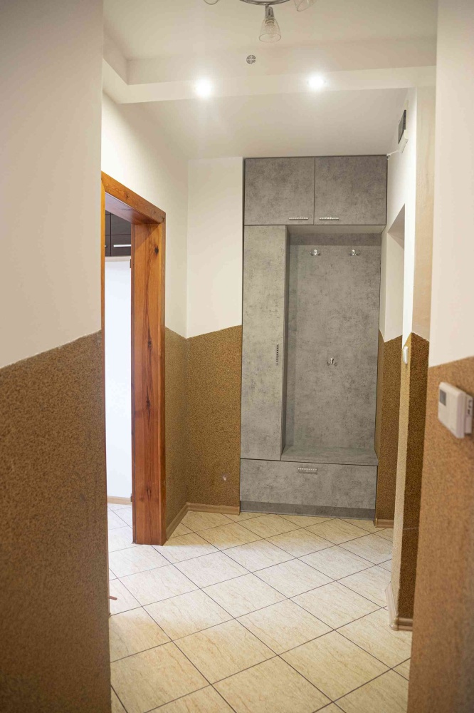 -przedpokój z szafą na ubrania i buty, doskonale komunikujący wszystkie pomieszczenia.