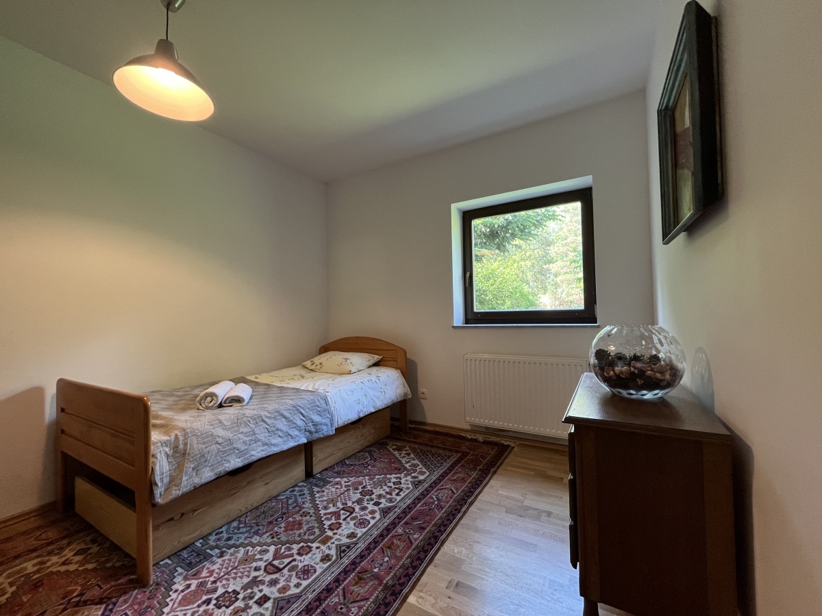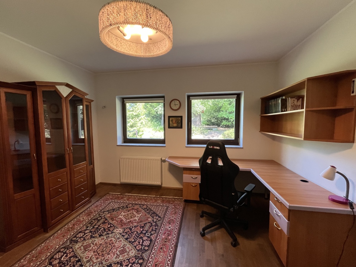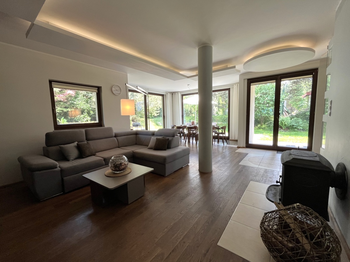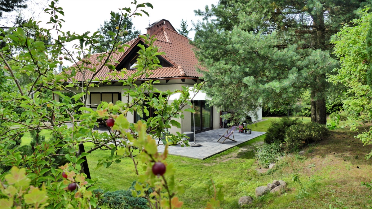 Dom o klimatycznym wnętrzu, widok z okien na cztery strony świata. Jasne pomieszczenia, nasłonecznione, w każdym pokoju widok na zieleń. Okna drewniane wysokiej jakości, na podłogach parkiet dębowy, panele w 2 małych sypialniach i wysokiej jakości glazura i terakota. Ściany o jasnej kolorystyce, wszystkie łazienki oraz część kuchenna w glazurze i terakocie. Kuchnia o pełnym wyposażeniu – okap, kuchenka, zmywarka, piekarnik, ekspres do kawy, zabudowa kuchenna wysokiej jakości. Teren ogrodzony, dojazd utwardzony.