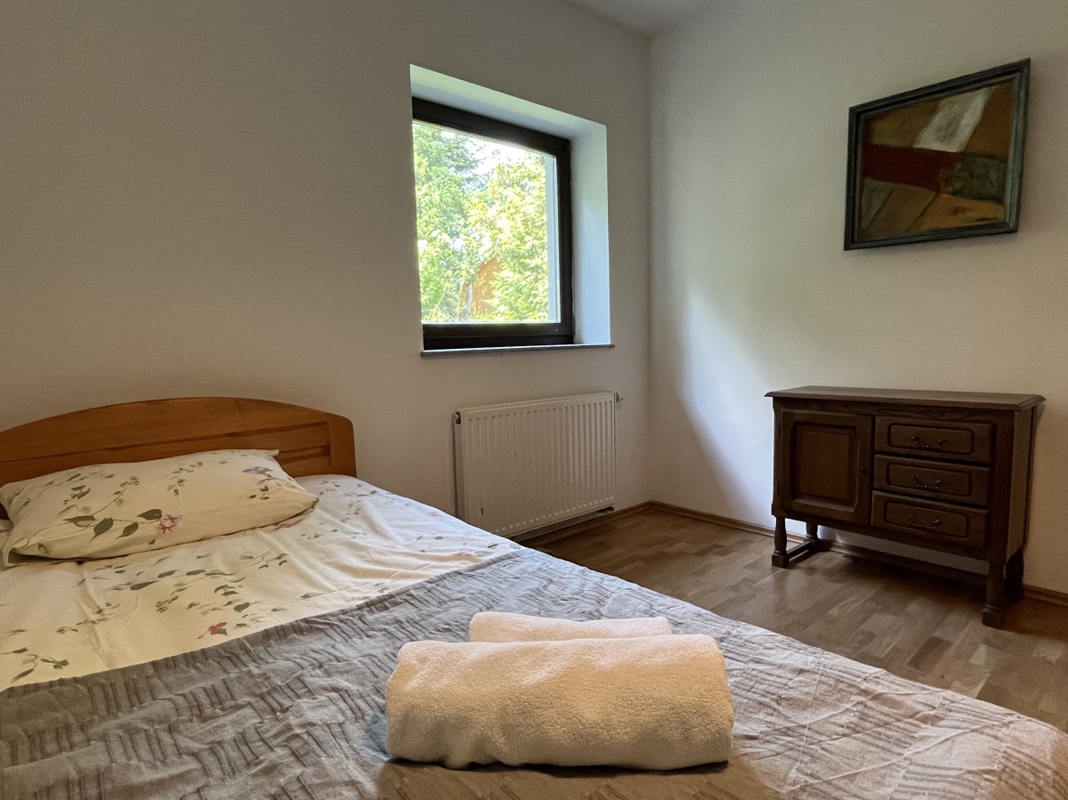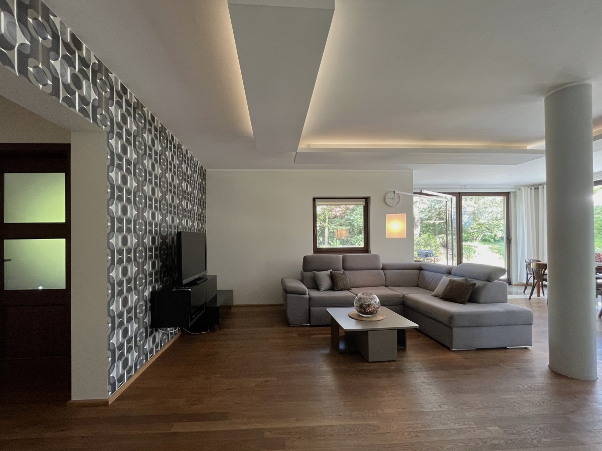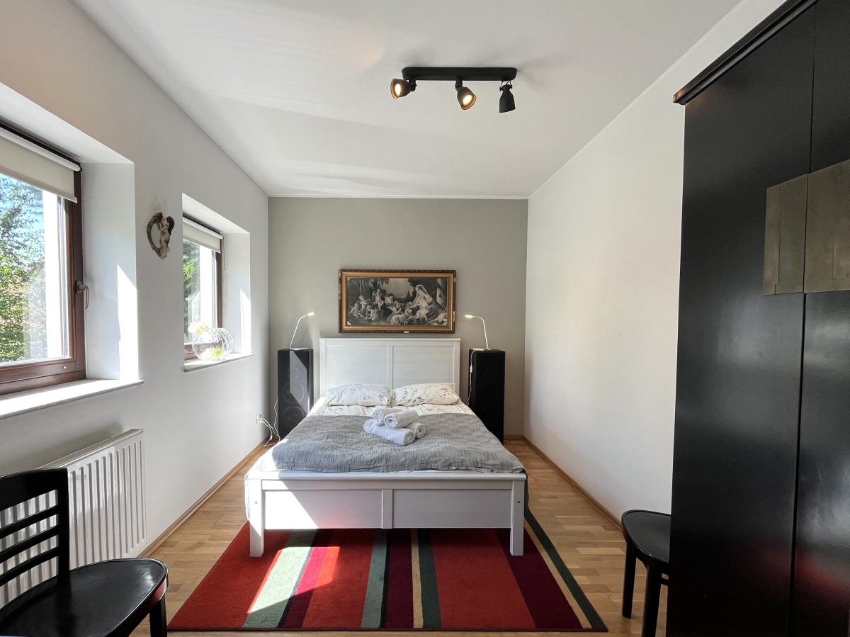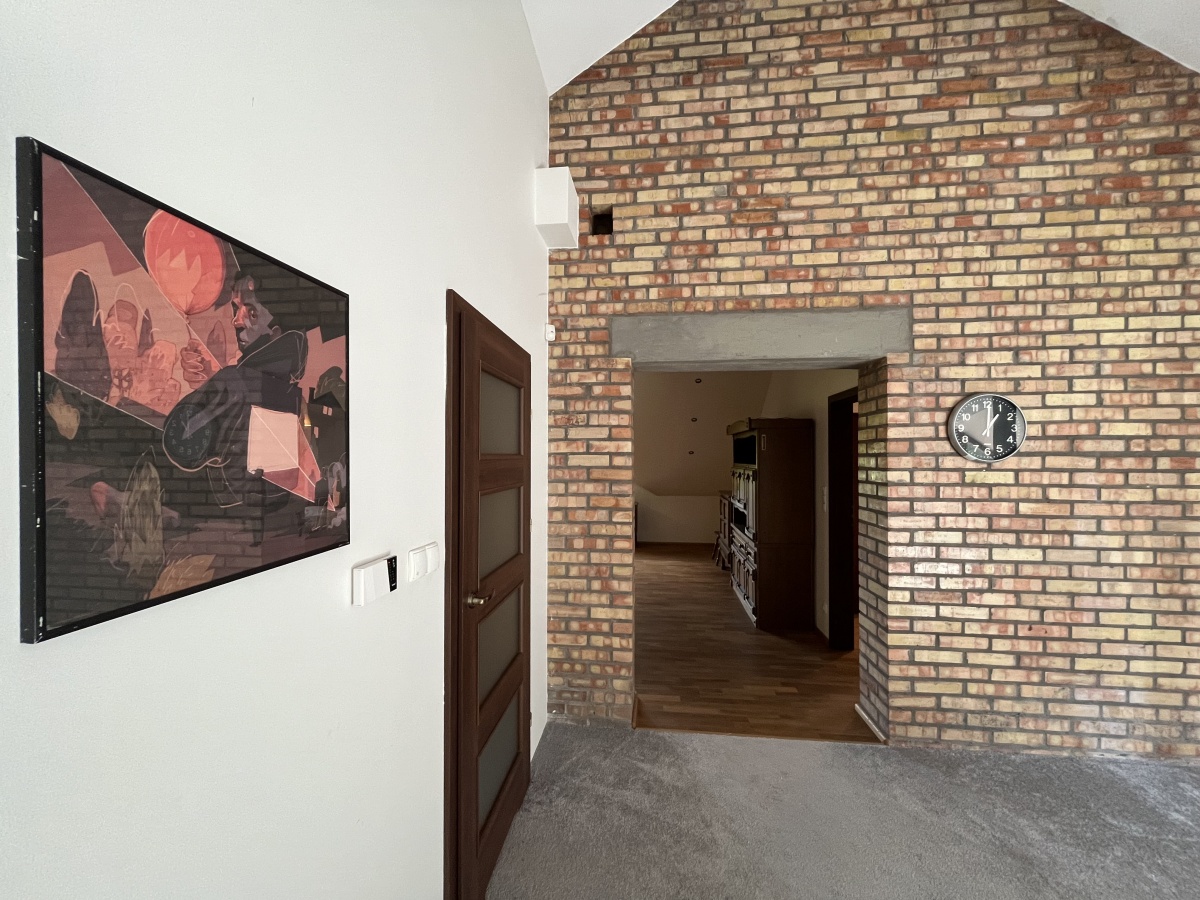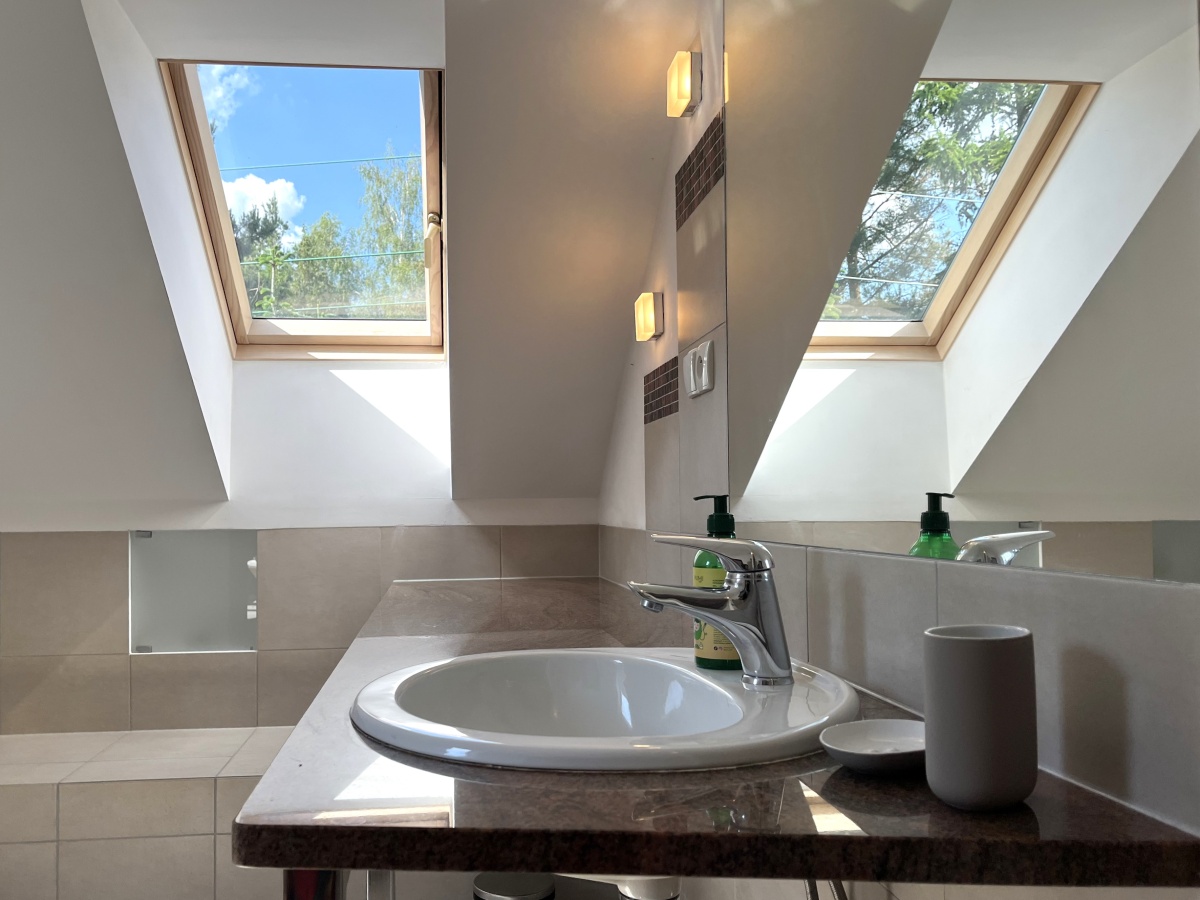 Dom o klimatycznym wnętrzu, widok z okien na cztery strony świata. Jasne pomieszczenia, nasłonecznione, w każdym pokoju widok na zieleń. Okna drewniane wysokiej jakości, na podłogach parkiet dębowy, panele w 2 małych sypialniach i wysokiej jakości glazura i terakota. Ściany o jasnej kolorystyce, wszystkie łazienki oraz część kuchenna w glazurze i terakocie. Kuchnia o pełnym wyposażeniu – okap, kuchenka, zmywarka, piekarnik, ekspres do kawy, zabudowa kuchenna wysokiej jakości. Teren ogrodzony, dojazd utwardzony.