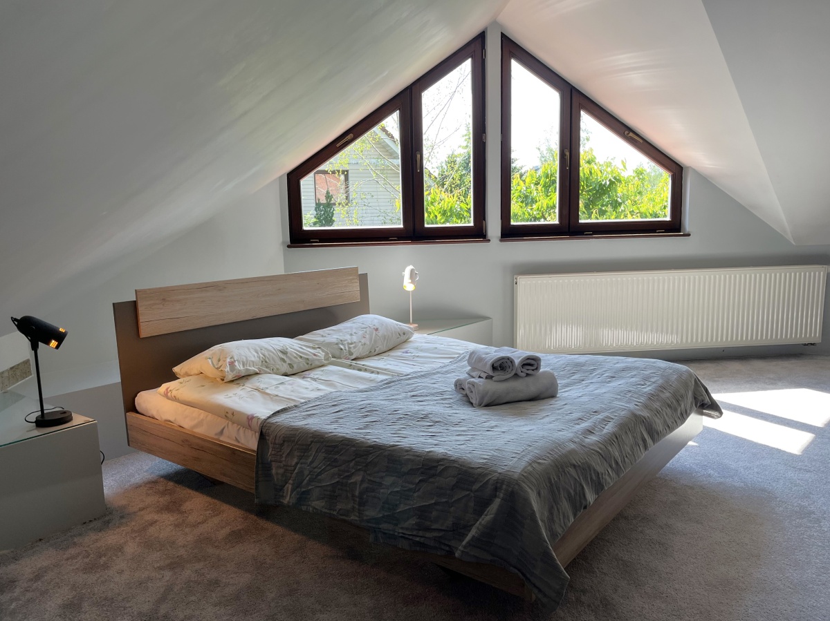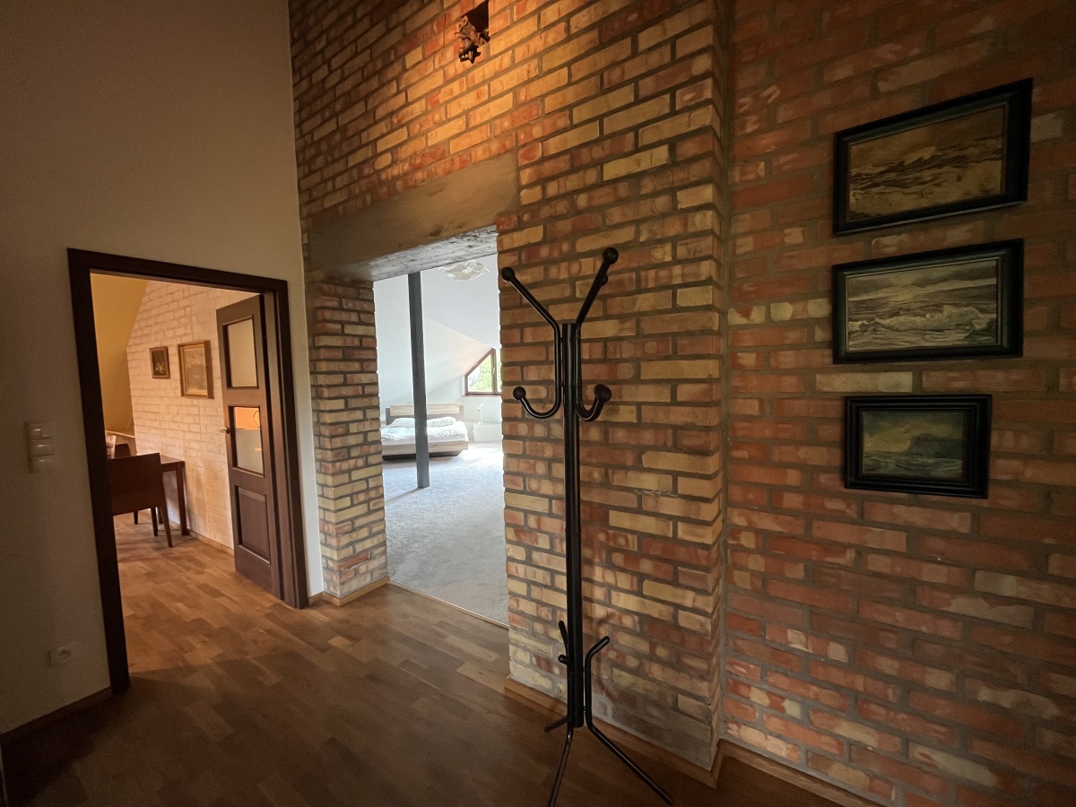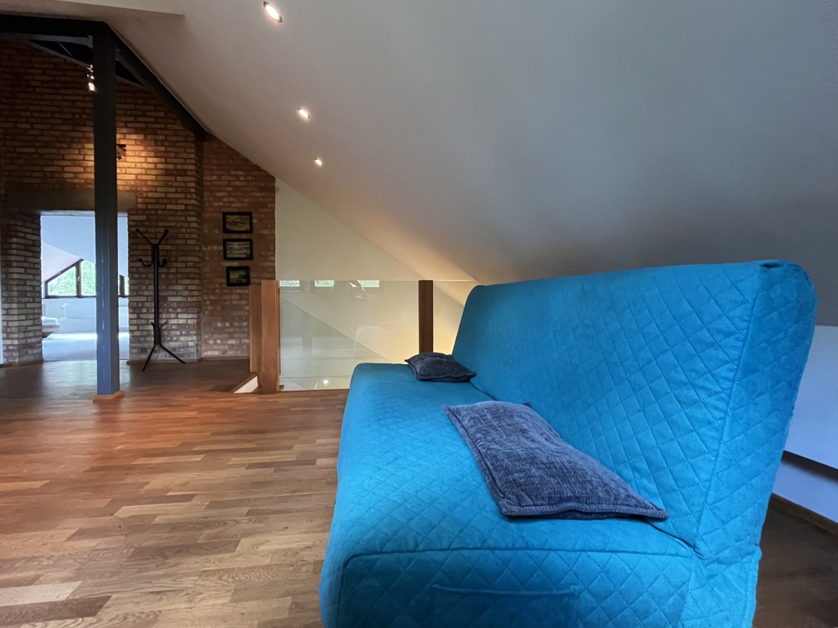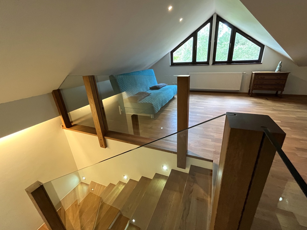 Klasyczne schody prowadzą na górne PIĘTRO z wysokimi pokojami. Tutaj samodzielne dwa pokoje/sypialnie (obie 21 m.kw); open space z kanapą (19,64 m.kw); pokój kąpielowy (duża łazienka z wanną i toaletą) (6,45 m.kw); garderoba z pralnią (5,86 m.kw).