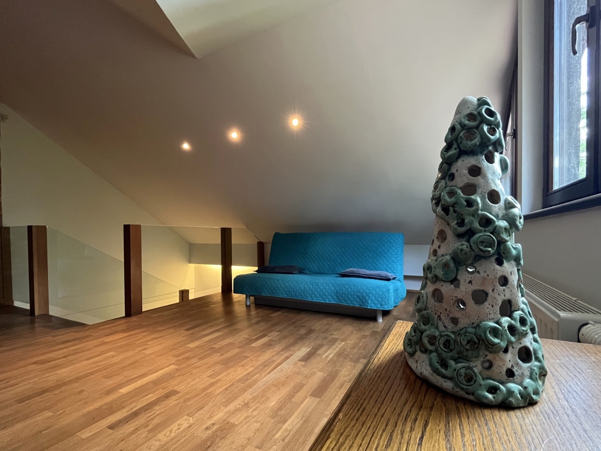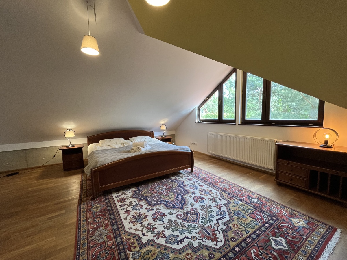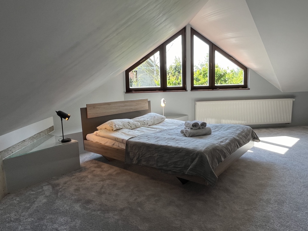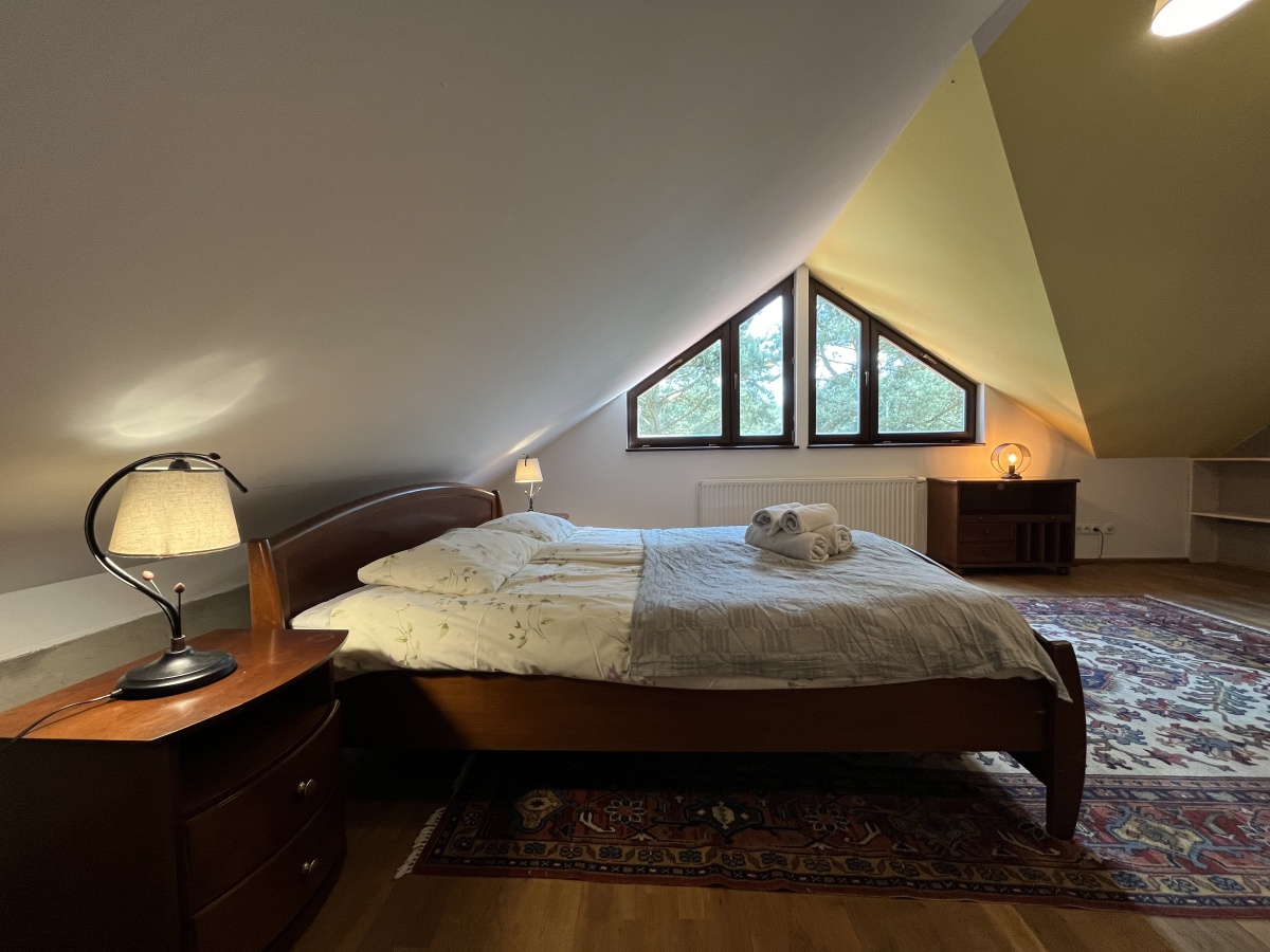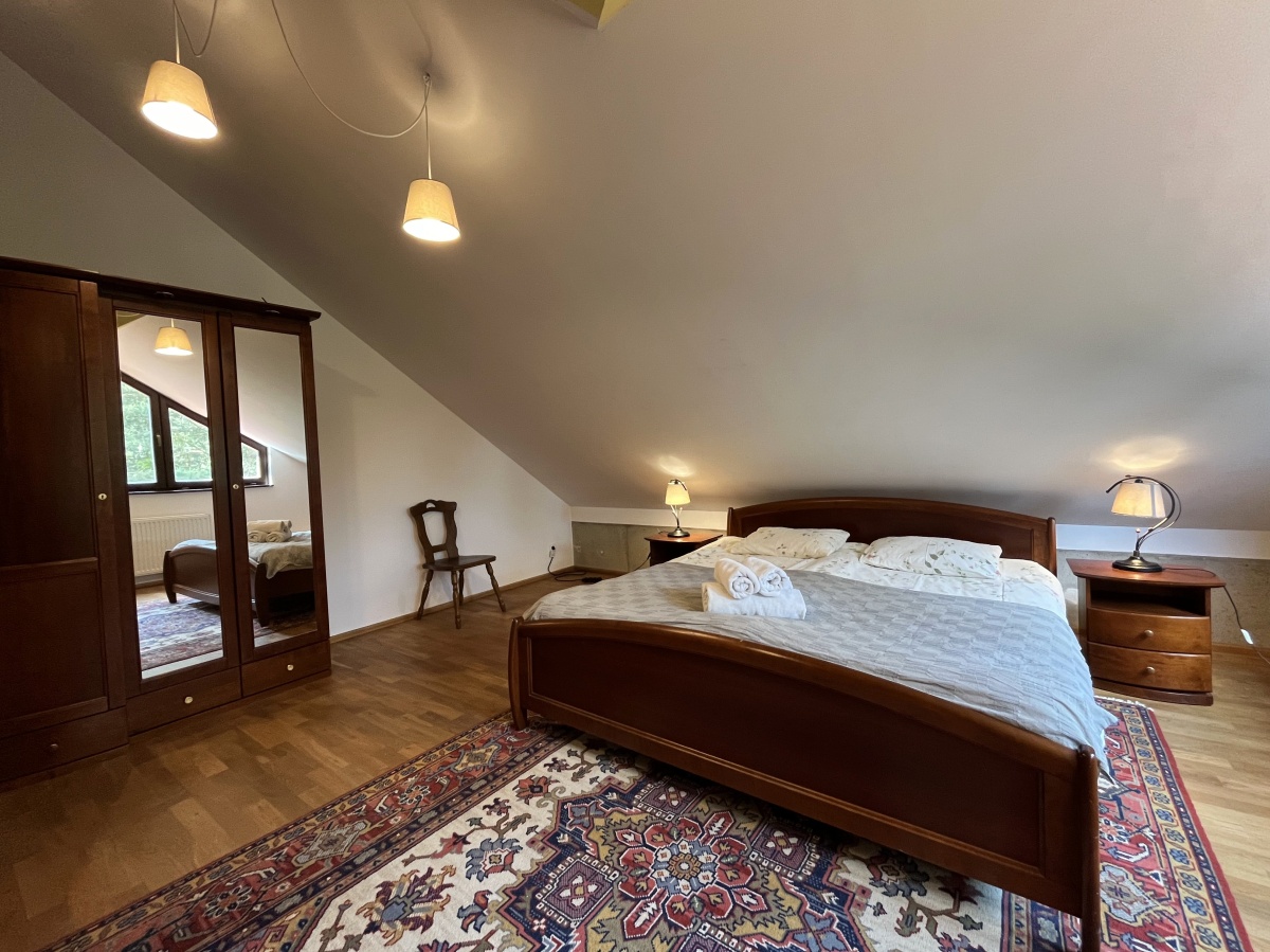 Klasyczne schody prowadzą na górne PIĘTRO z wysokimi pokojami. Tutaj samodzielne dwa pokoje/sypialnie (obie 21 m.kw); open space z kanapą (19,64 m.kw); pokój kąpielowy (duża łazienka z wanną i toaletą) (6,45 m.kw); garderoba z pralnią (5,86 m.kw).