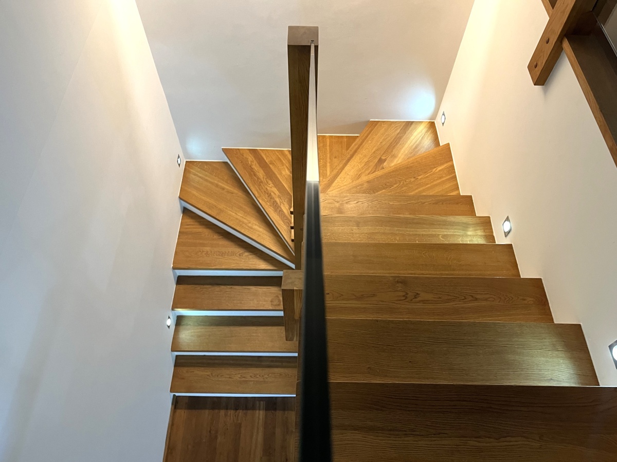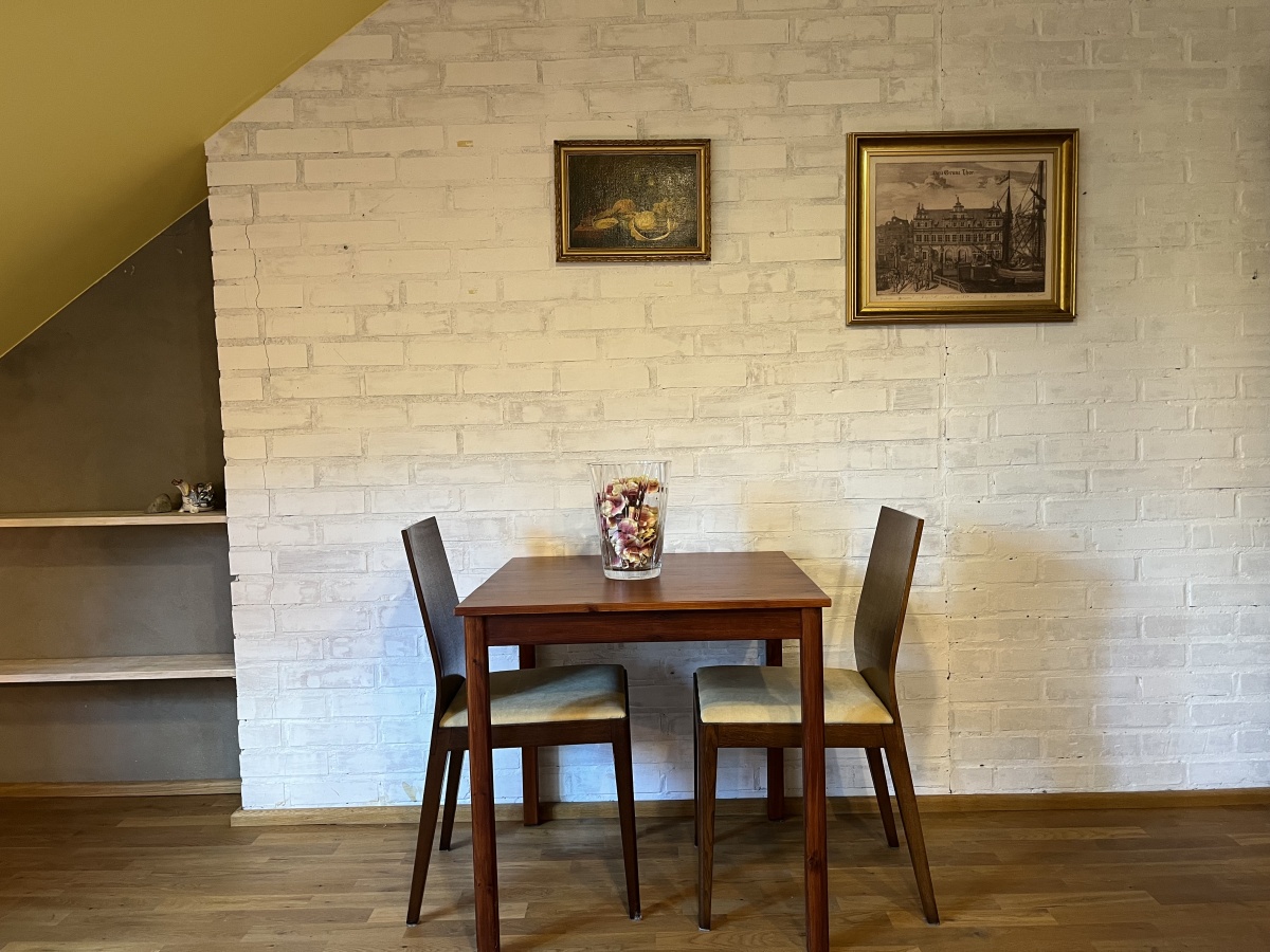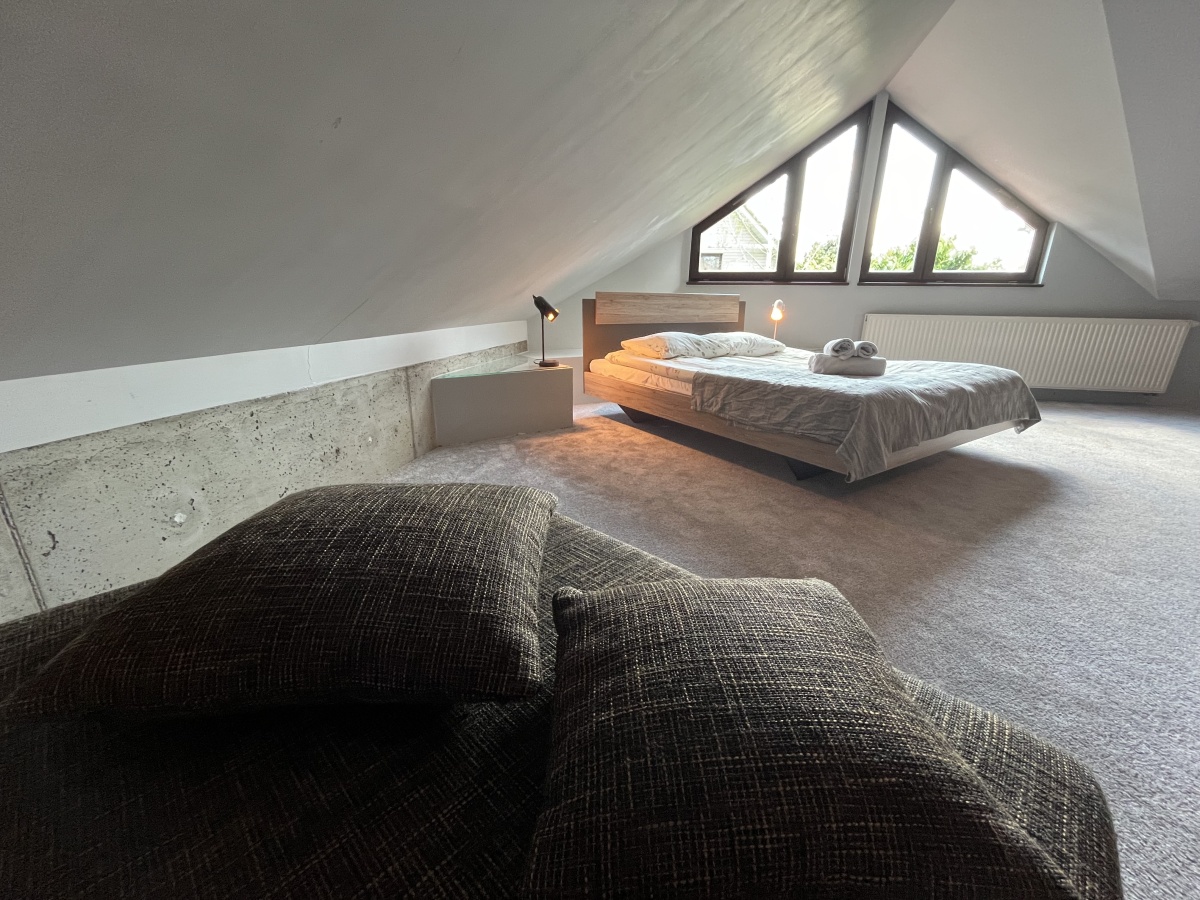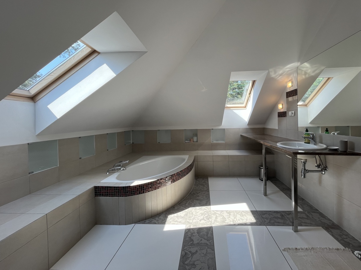 Klasyczne schody prowadzą na górne PIĘTRO z wysokimi pokojami. Tutaj samodzielne dwa pokoje/sypialnie (obie 21 m.kw); open space z kanapą (19,64 m.kw); pokój kąpielowy (duża łazienka z wanną i toaletą) (6,45 m.kw); garderoba z pralnią (5,86 m.kw).
