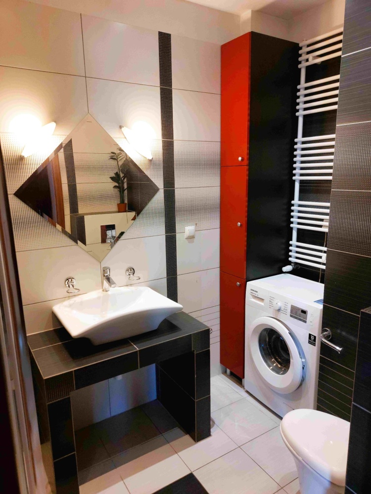 – łazienka z kabiną prysznicową typu walk-in, WC, umywalką i pralką (4,7 m2).