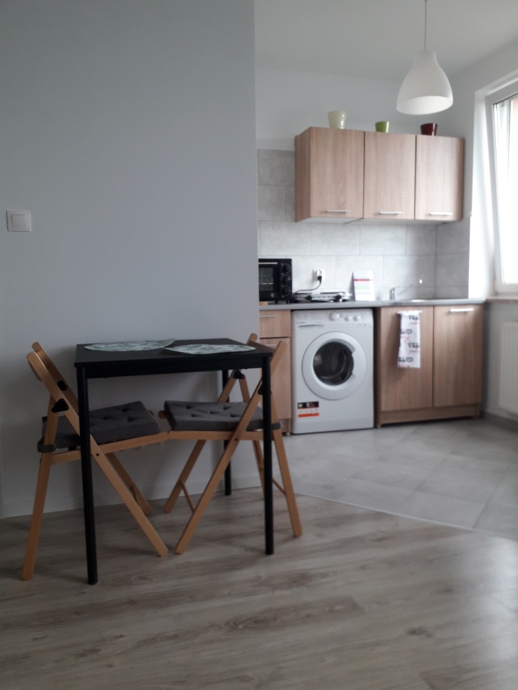 Salon z aneksem kuchennym i urządzona łazienka. Mieszkanie całkowicie wyposażone, do zamieszkania.
