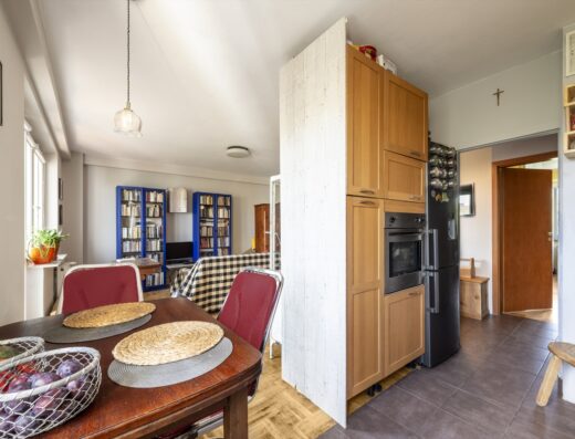 Z salonu można przejść do prawie 11 m2 kuchni wraz z jadalnią, która jest połączona z salonem , daje możliwość jej zamknięcia przez 4 – dzielne składane drzwi. Kuchnia wyposażona w pełni w sprzęt AGD oraz wyposażenie kuchenne.