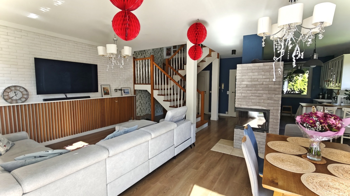 W salonie znajduje się kominek z płaszczem wodnym posiadający niezbędne certyfikaty do używania go jeszcze przez wiele lat.