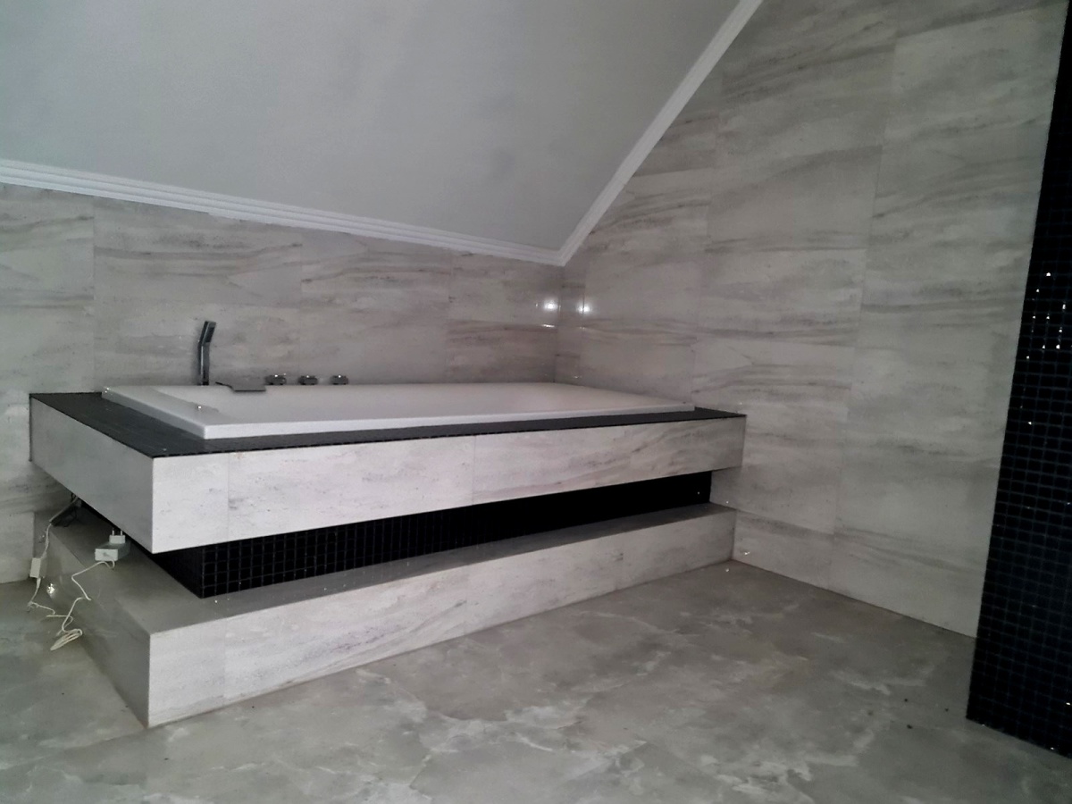 W kotłowni, łazience oraz toalecie na poddaszu zarówno na ścianach, jaki i podłodze położone zostały płytki ceramiczne wysokiej jakości. Również schody prowadzące na poddasze obłożono płytkami ceramicznymi, ponadto ściana przy schodach ozdobiona została tynkiem dekoracyjnym wpisującym się w nowoczesne trendy.