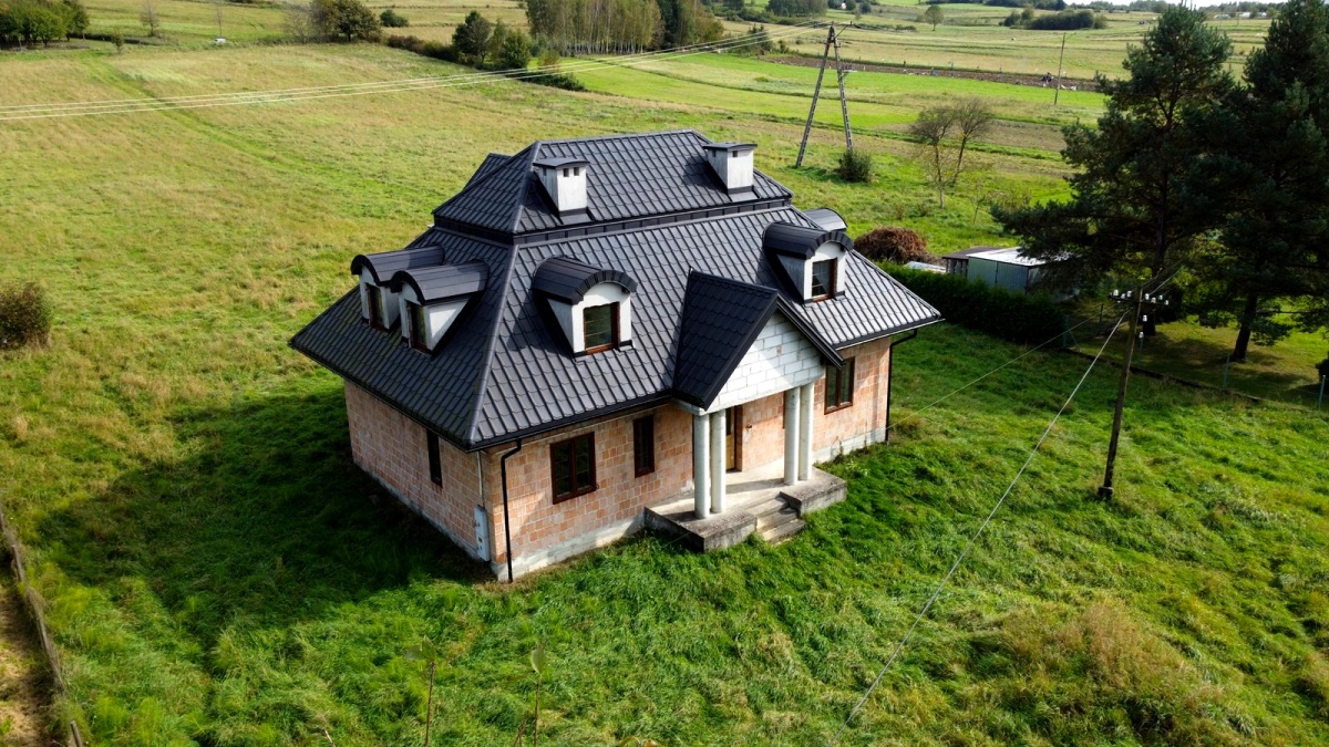 Prezentowany parterowy budynek jednorodzinny z użytkowym poddaszem wybudowany został z pustaka ceramicznego MAX, fundamenty zaizolowane przeciwwilgociowo, wszystkie przyłącza wykonane (za wyjątkiem: instalacji kotłowni, kotła grzewczego oraz grzejników). Dach o konstrukcji wielospadowej pokryty został blacho dachówką w kolorze antracytowym i kompletnie orynnowany. Prezentowana nieruchomość wybudowana została z zachowaniem wysokich standardów odpowiadających wymogom warunków technicznych oraz nowoczesnych rozwiązań techniki budowlanej.