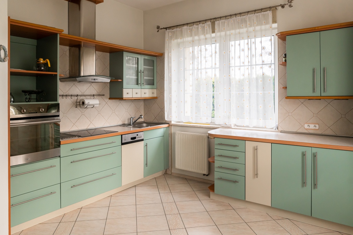 Kuchnię w każdej części wyposażono w zabudowę na wymiar, płytę ceramiczna dużą, zabudowaną lodówkę z zamrażarką, zmywarkę oraz piekarnik z wygodnym dostępem.