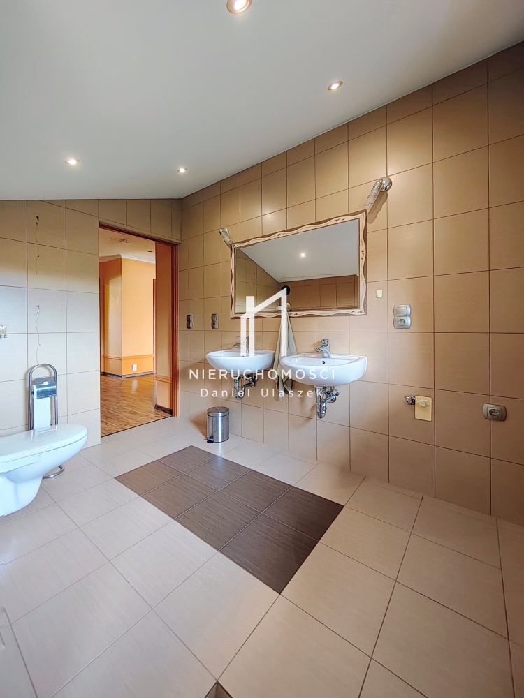 Duża łazienka rodzinna z narożną wanną, dwiema umywalkami i opcją podłączenia pralki