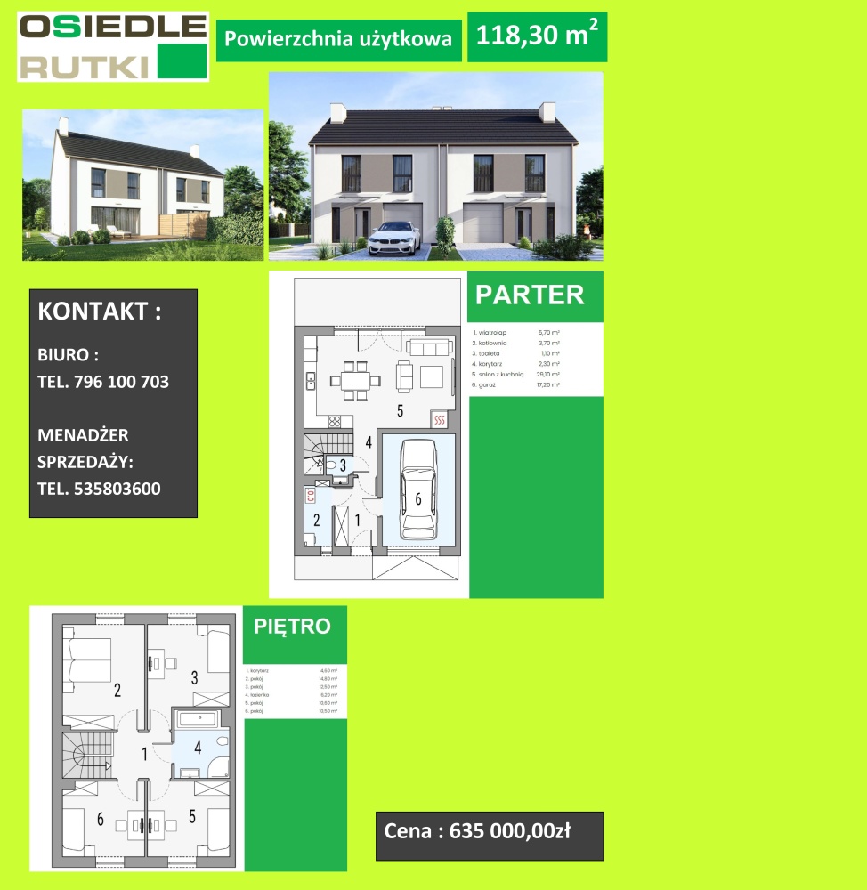 Cena budynku obejmuje wykonane ściany działowe, tynki gipsowe oraz instalacje tylko na parterze, otwory przygotowane do montażu ościeżnic i drzwi wewnętrznych.