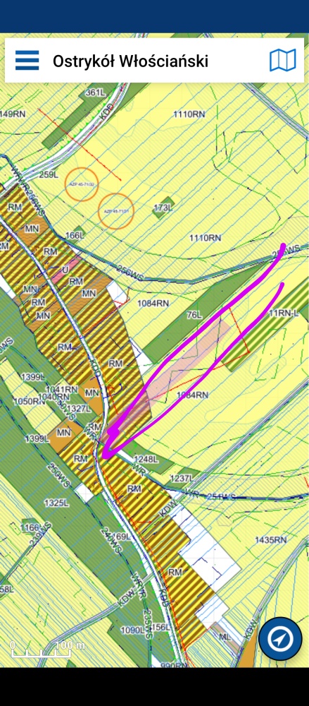 Działka w kształcie prostokąta o szerokości ok.20 m i długość ok. 470 m .Działka przylega pod lekkim kątem (skosem) do drogi o szer. ok 30 m.