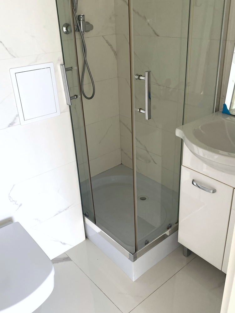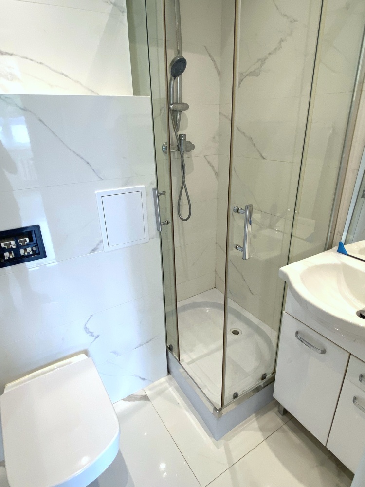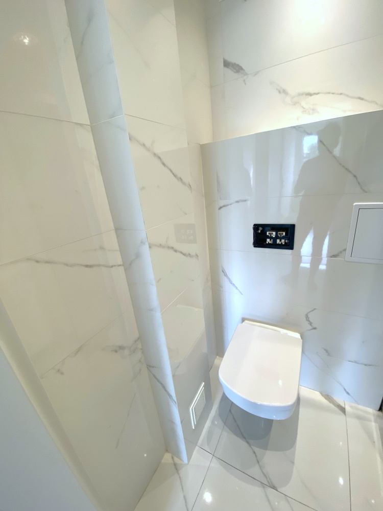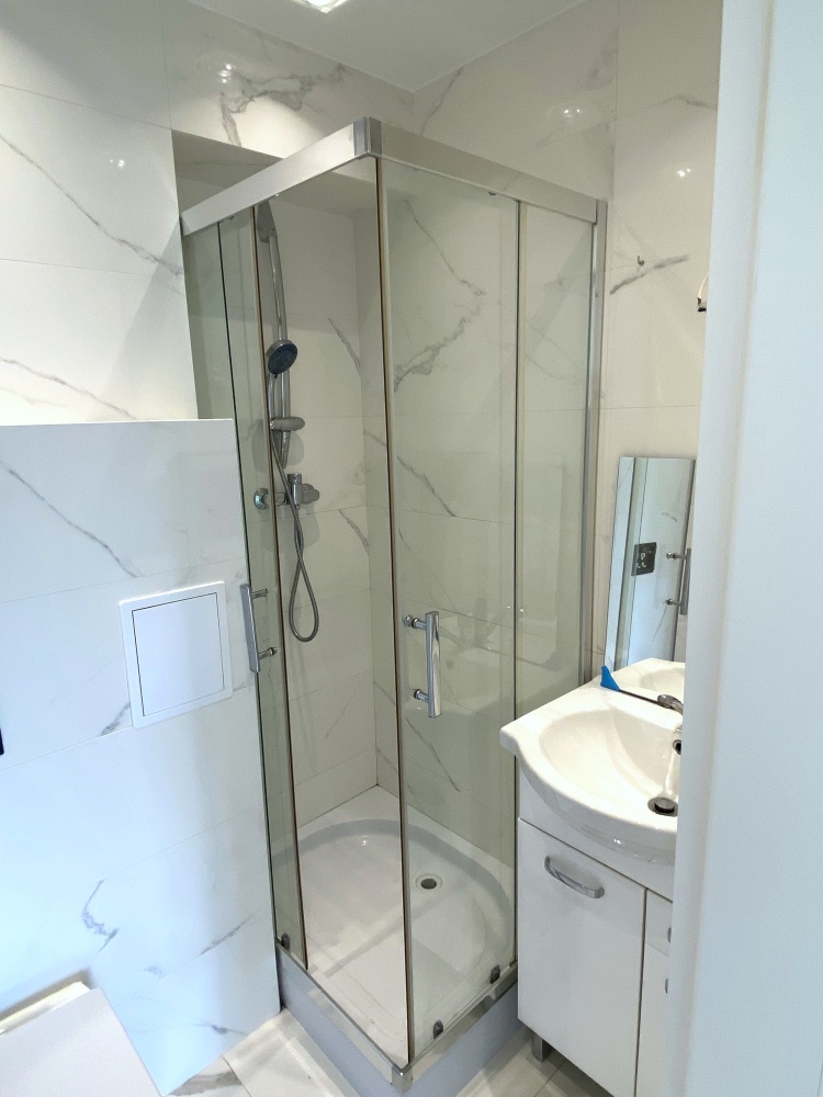 Łazienka w modnych płytkach, z kabiną prysznicową oraz kompaktem WC w zabudowie.( na zdjęciu brak przycisku do WC, który będzie uzupełniony).