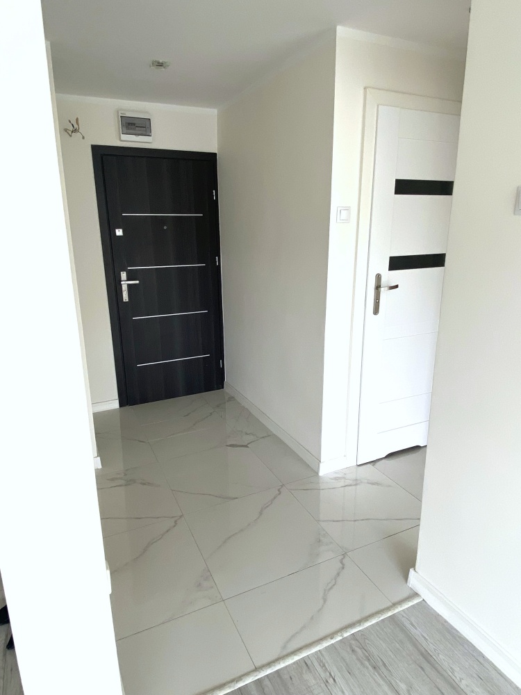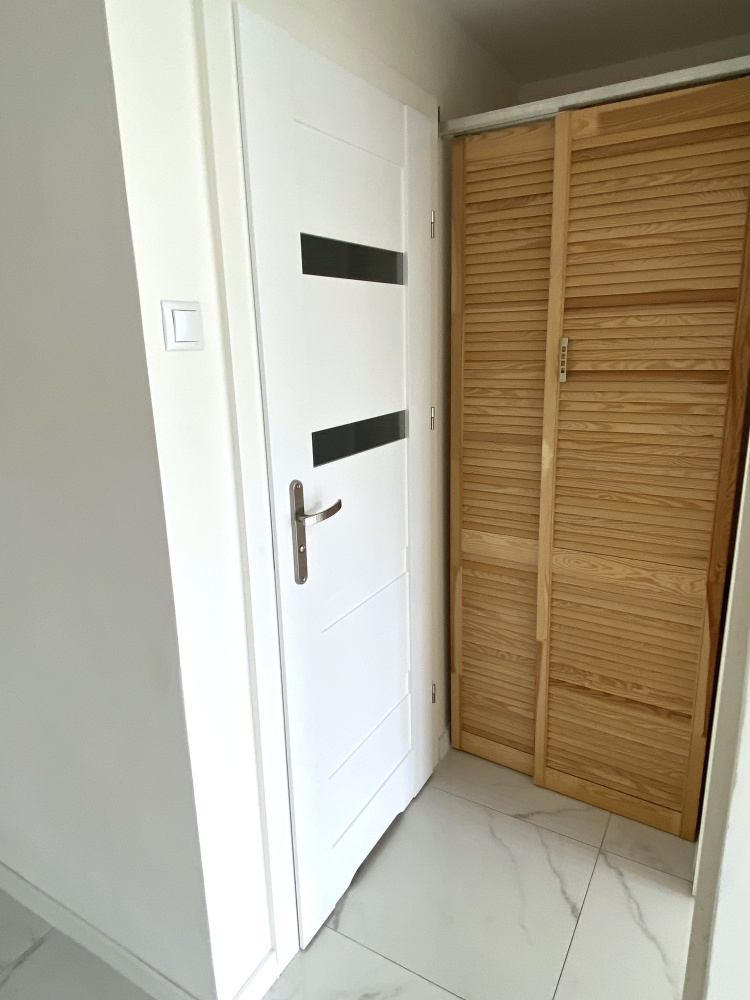 W przedpokoju zamontowane drzwi przesuwne do mini garderoby.