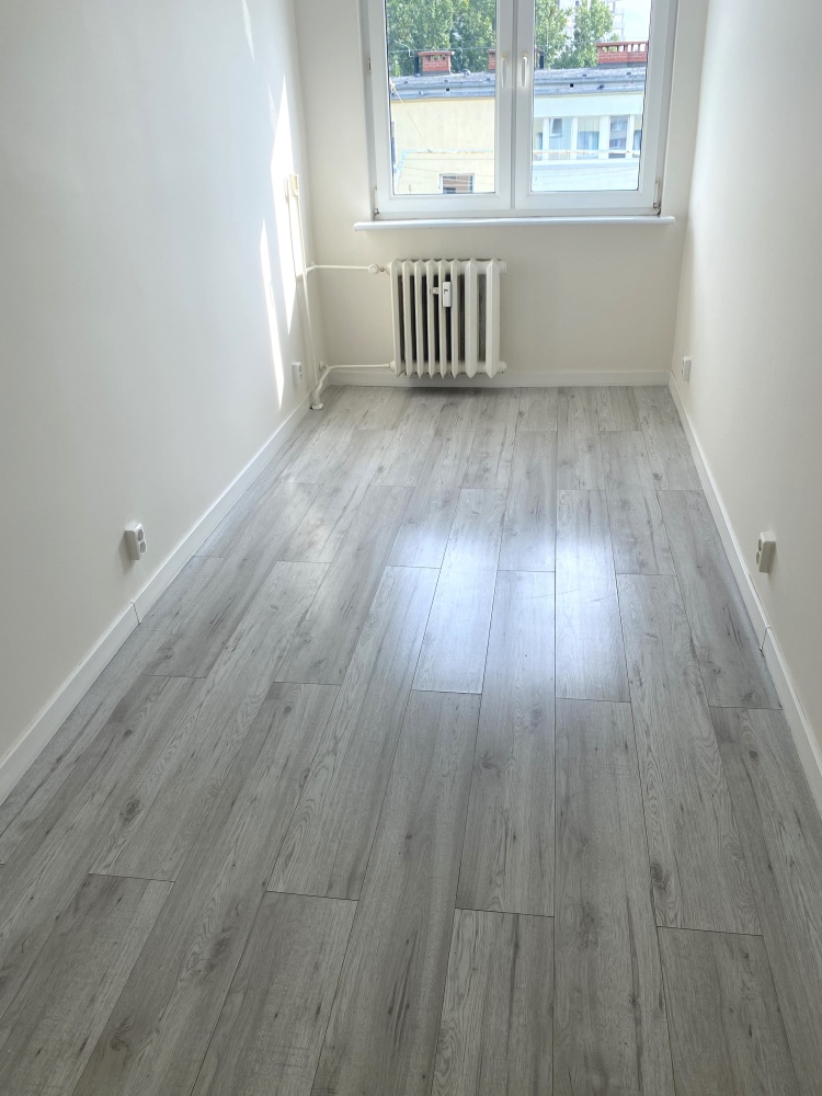 Na podłodze panele podłogowe i częściowe płytki.