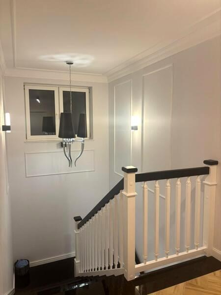 Piękne granitowe schody- Galaxy Star-czarny kamień ze złotymi drobnymi mieniącymi się ziarnami, połączone z białą drewnianą balustradą i lampą daje efekt harmonijnej luksusowej klatki schodowej.