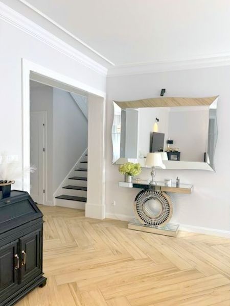 Przestronny, doświetlony salon z aneksem kuchennym to klasyka w nowoczesnym i wyrafinowanym wydaniu. Zastosowano prostą neutralna bazę: jasne podłogi (gresy) i ściany oraz kilka antycznych, mocnych akcentów. Sufity zdobi sztukateria.