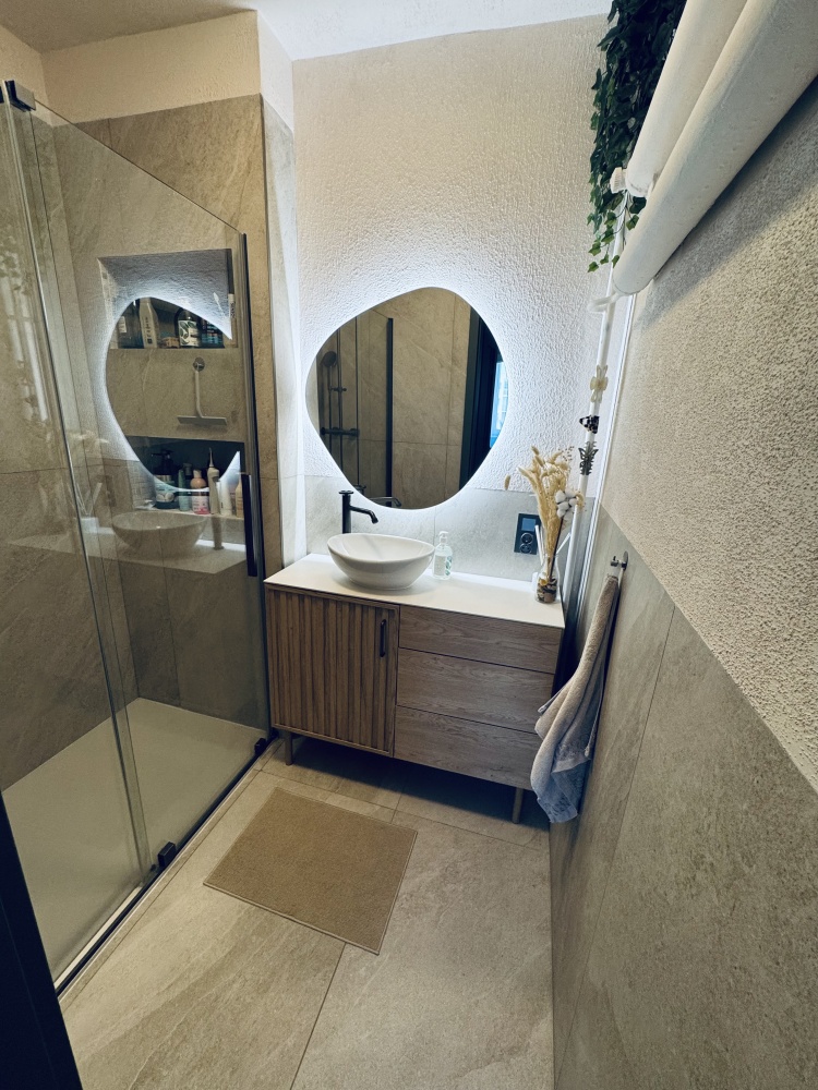 Osobno łazienka i wc wykończone wysokiej jakości gresem, blat ze spieku kwarcowego. W wc przygotowana instalacja do montażu mini umywalki (jest kupiona Villeroy&Boch wraz z baterią jak w reszcie mieszkania oraz odpływ w kolorze grafitowym)