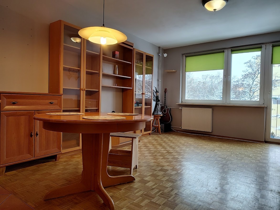 Wynajmę mieszkanie 3-pokojowe o pow. 46,3m2 z kuchnią w aneksie na 2. piętrze w 4.piętrowym budynku na os. Niedźwiadek przy ul. Wojciechowskiego. Nie ma balkonu – jest kratka balkonowa.