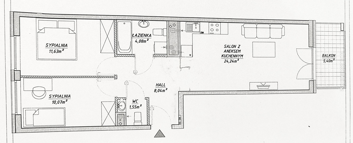 Salon z aneksem kuchennym, dwie sypialnie, łazienka, schowek (z możliwością przekształcenia w toaletę), przedpokój.