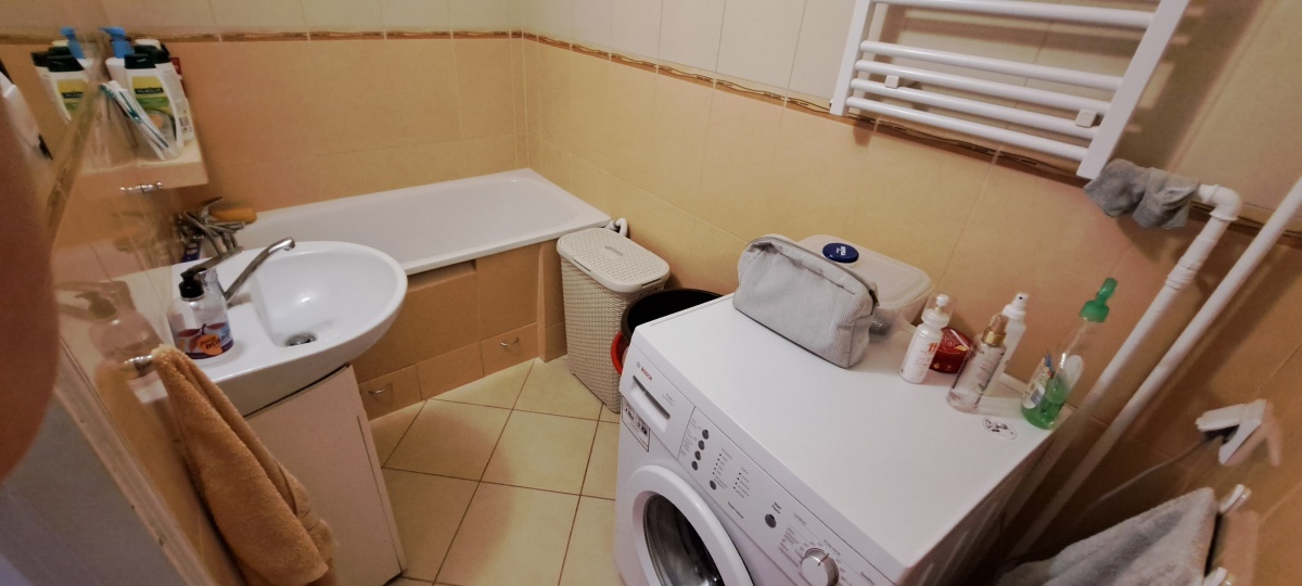 – wykafelkowanej łazienki z wanną i umywalką o pow. około 4 m2.