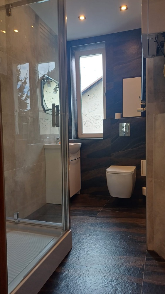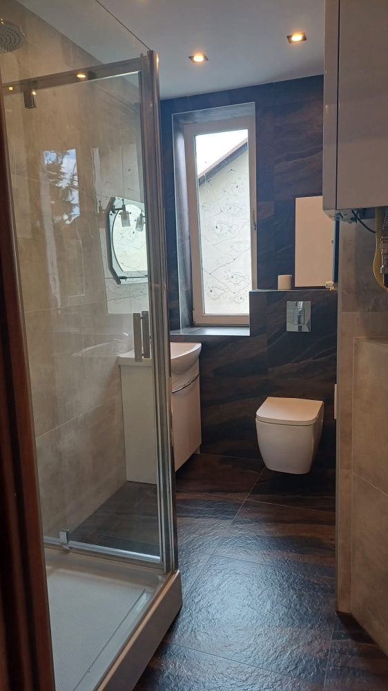 Dwie świeżo wyremontowane łazienki, jedna toaleta z pralnia, druga z nowa kabina prysznicowa, toaletą i umywalka.