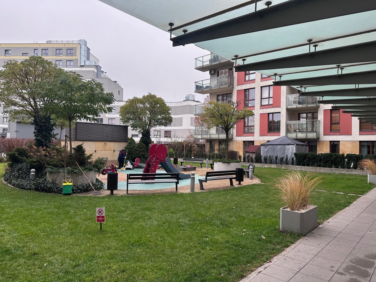 • Teren wspólny: Ogrodzone i strzeżone osiedle z wewnętrznym patio i placem zabaw.