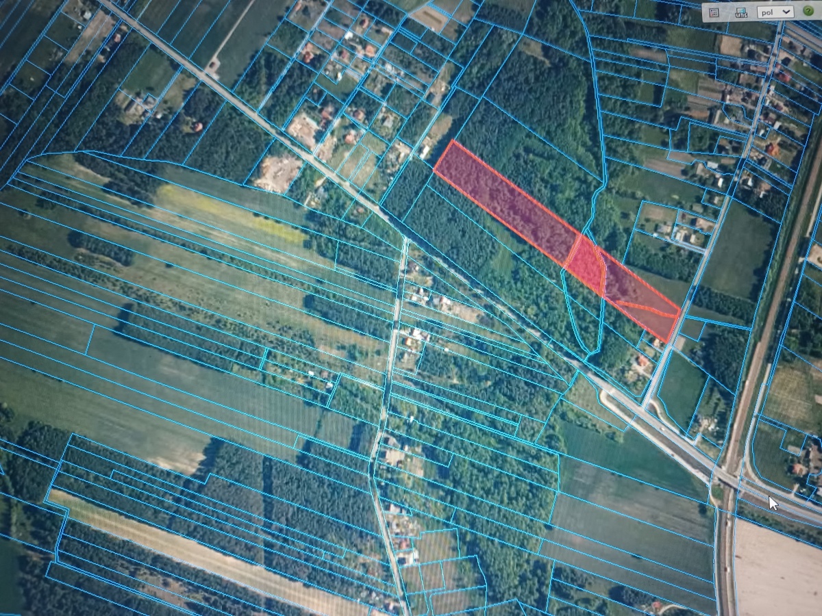 Działka w kształcie prostokąta o szerokości 60m x 500 m długości.