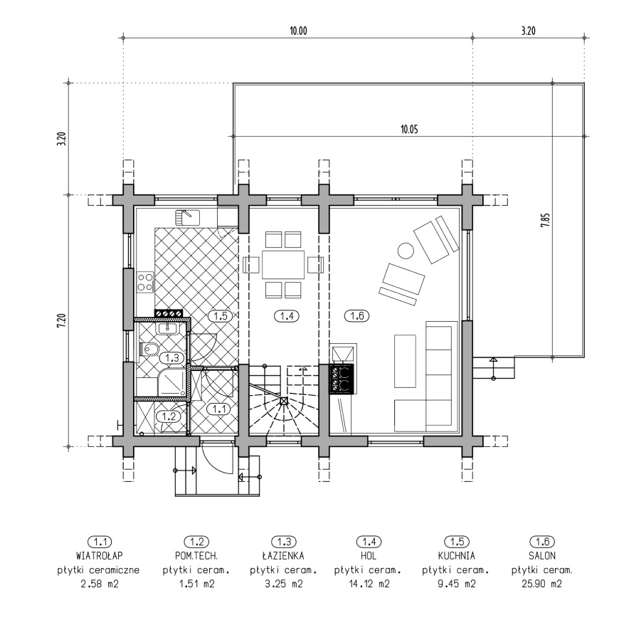 Wiatrołap, pom. techniczne, łazienka, hol, kuchnia z jadalnią, przestronny salon z dużym oknem