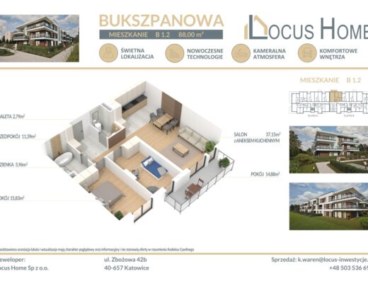 dotyczy mieszkania trzypokojowego o łącznej powierzchni 55,02m², położonego na pierwszym piętrze z balkonem w cenie ok. 8.000zł/m². (4)