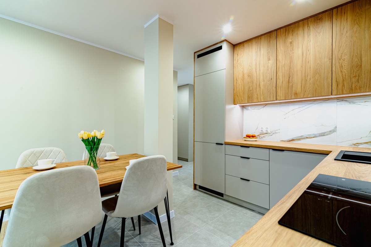 – Nowe meble na wymiar od stolarza (kuchnia, przedpokój, szafka z umywalką w łazience)