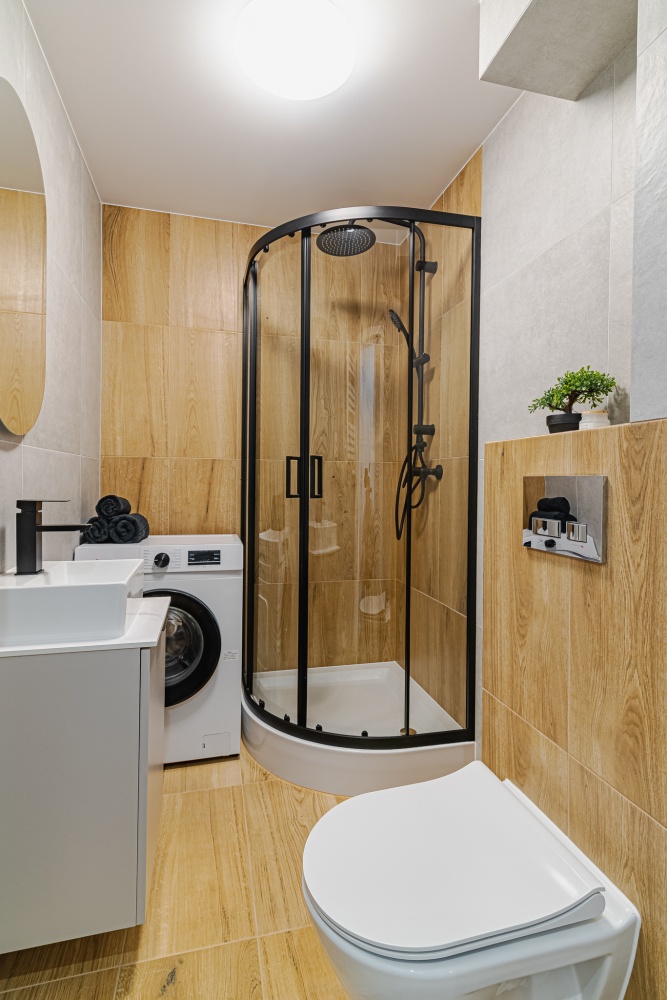 – Nowe sprzęty AGD (pralka, lodówka, płyta indukcyjna, okap, piekarnik, zmywarka)