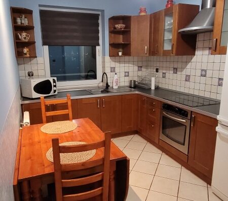 • Dodatkowo w mieszkaniu znajdują się pralka, lodówka, czajnik, kuchenka gazowa, kuchenka mikrofalowa, odkurzacz, deska do prasowania, suszarki na bieliznę, ekspres do kawy