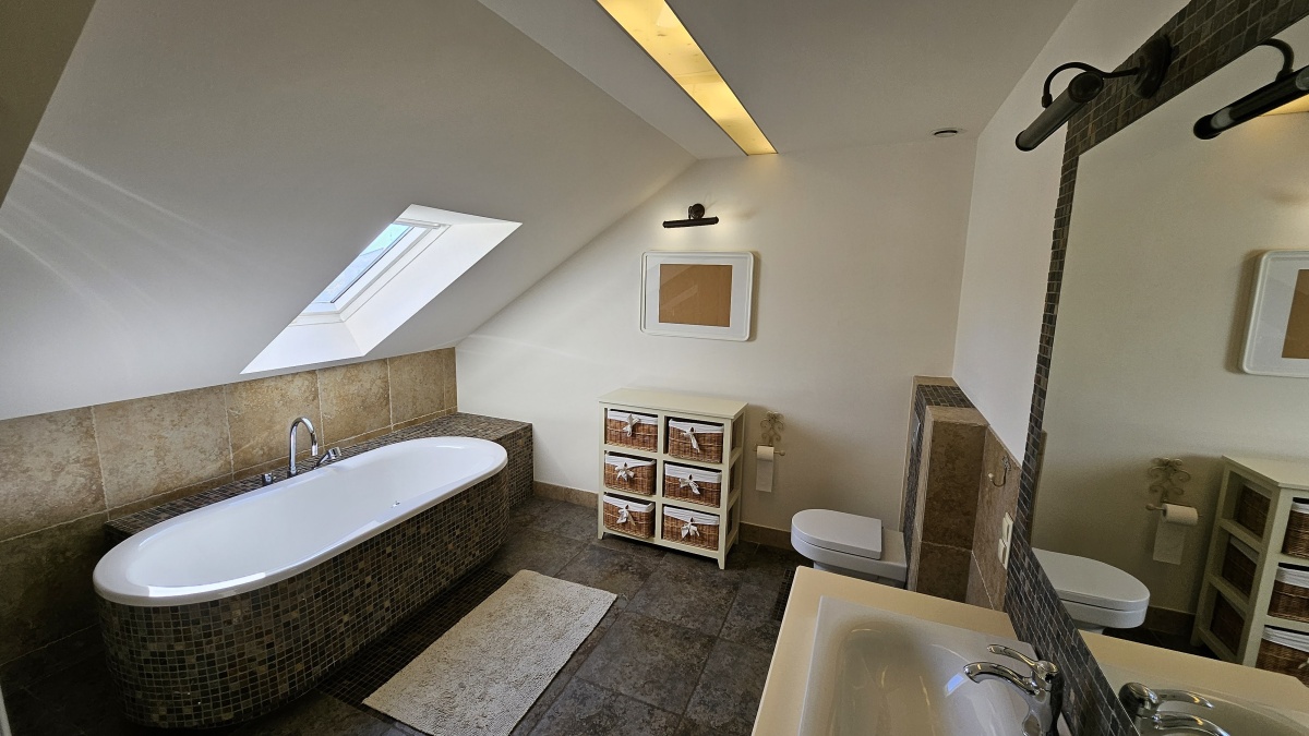 Piętro: powierzchnia około 125 m²: dwie sypialnie, łazienka z wanną i prysznicem (wspólna), sypialnia główna z garderobą i dedykowaną łazienką z wanną i prysznicem.