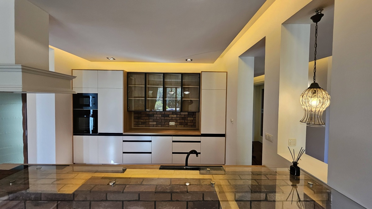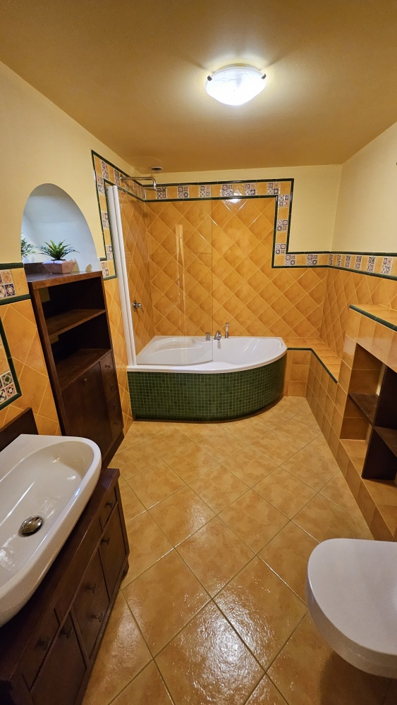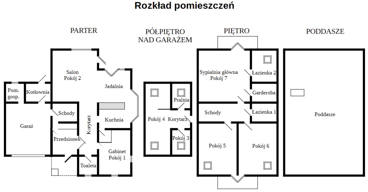 Parter: powierzchnia około 125 m²: przedsionek z ładną i funkcjonalną szafą i przejściem do garażu, toaleta gościnna, gabinet/sypialnia, nowy aneks kuchenny (w pełni wyposażony) z wykuszem i spiżarnią, jadalnia, salon z kominkiem z płaszczem wodnym (dodatkowe źródło ogrzewania c.o. i c.w.u.).