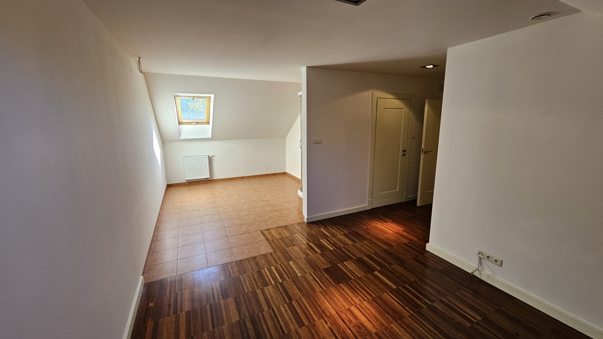 Półpiętro: powierzchnia około 40 m² (przestrzeń nad garażem): pralnia z suszarnią, siłownia z prysznicem i zaplanowanym miejscem na saunę, otwarty pokój/sypialnia, kolejny pokój.