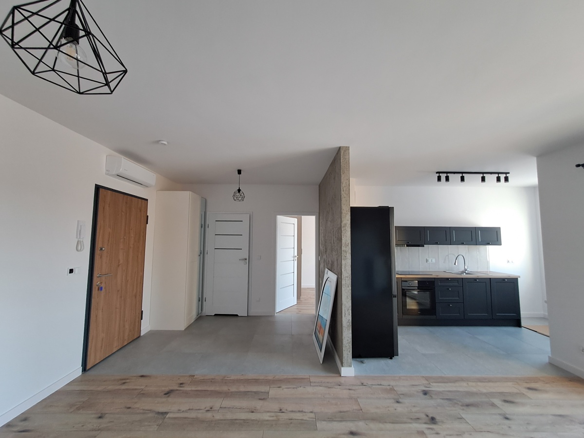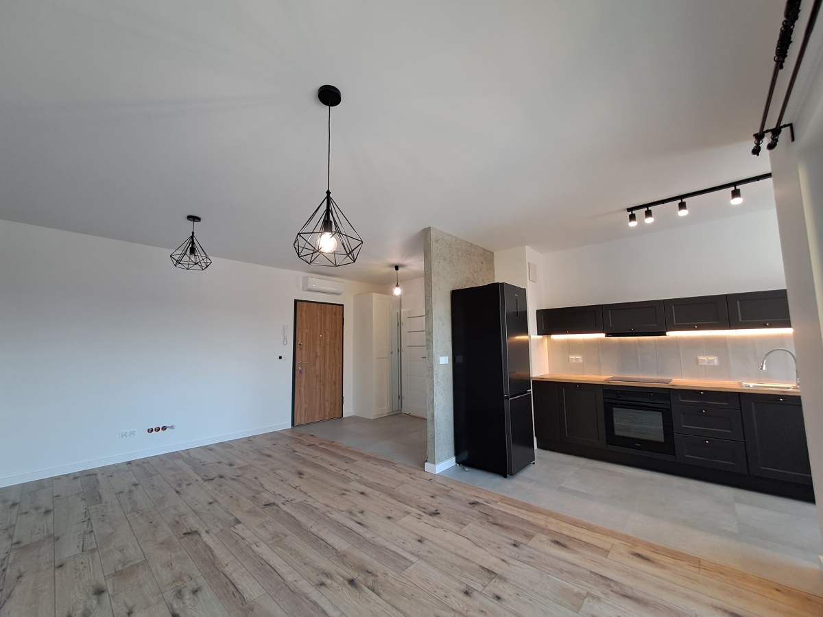 -jasny salon z kuchnią wyposażoną w AGD i z wyjściem na balkon