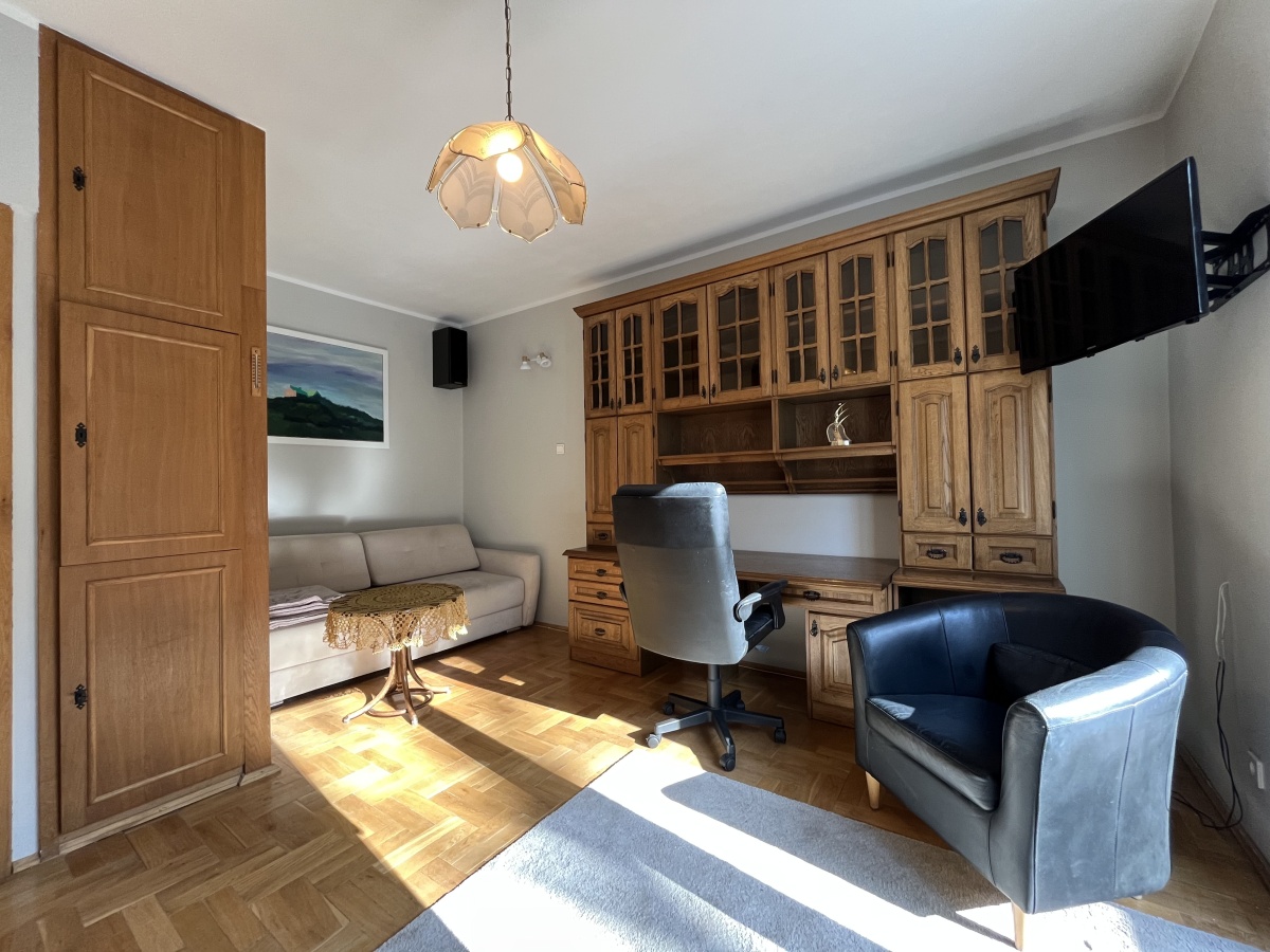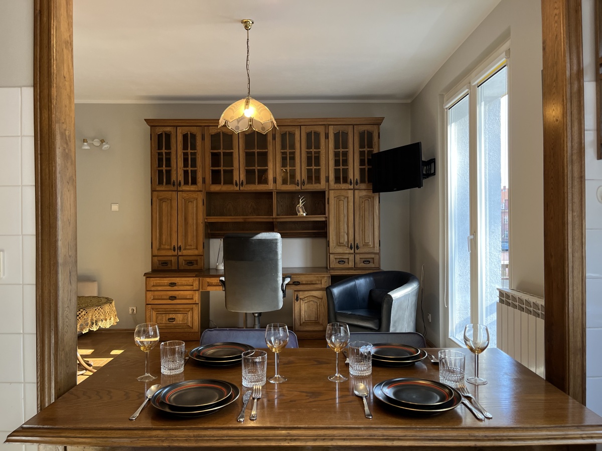 Przestronny salon z wyjściem na balkon połączony jest z wygodną kuchnią. Kuchnia w pełni wyposażona – nowe kuchenka, zmywarka, lodówka, ekspres do kawy, naczynia i sztućce. W salonie kredens z biurkiem, szafa, stół z krzesłami, wygodna rozkładana kanapa, TV. Możliwość podłączenia internetu/TV UPC.