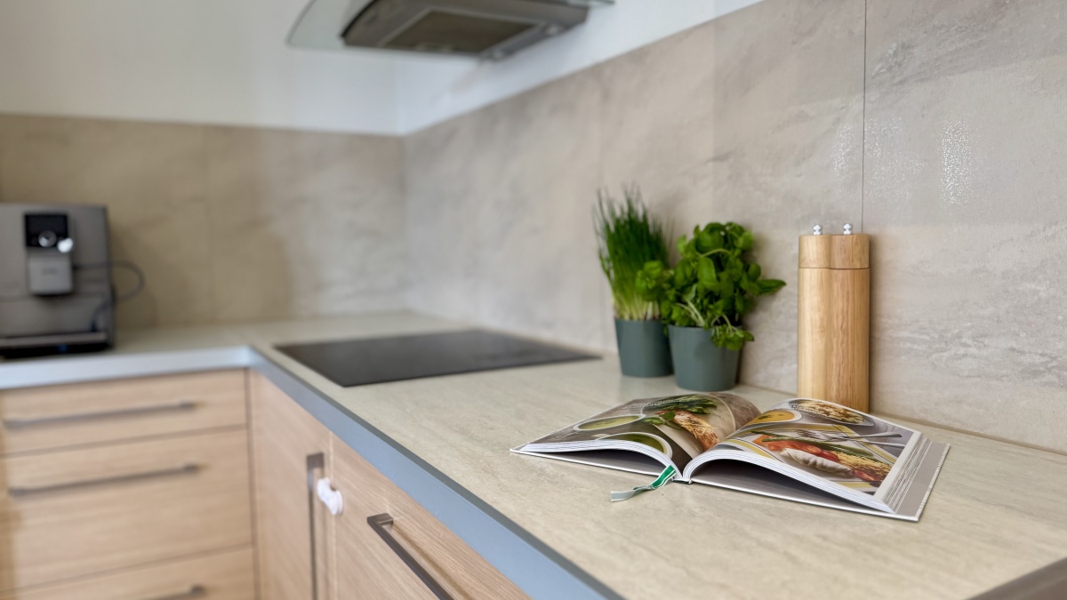 Kuchnia jest otwarta na salon i oferuje dużą ilość blatu roboczego oraz zabudowy. W mieszkaniu znajduje się także wiele praktycznych szaf, co znacząco podnosi komfort codziennego użytkowania