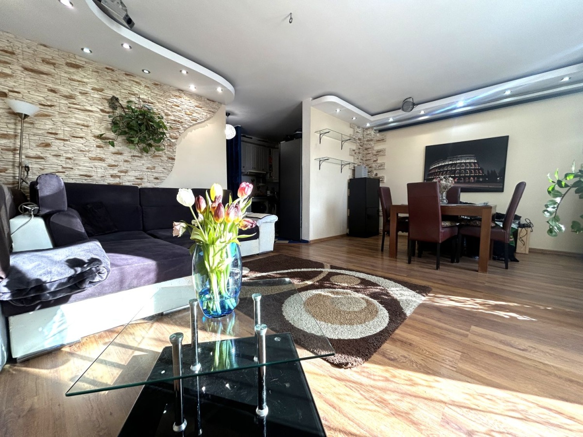 Na dole jest duży salon z aneksem kuchennym (34m2), oraz schowek pod schodami (4m2). Na górze do dyspozycji są dwa pokoje (12 i 15m2) oraz łazienka (ok 5m2). Okna w salonie zostały wymienione 3 lata temu, a dachowe pół roku temu (trzyszybowe).