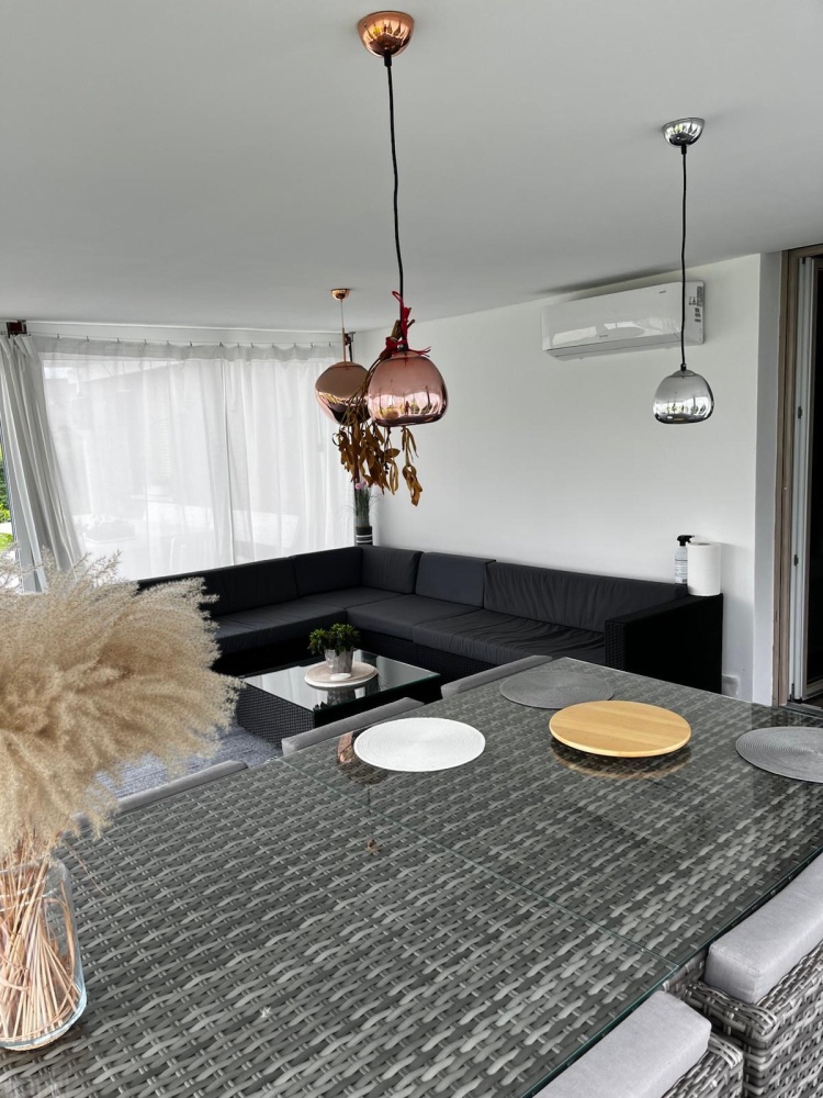 • Duży taras przylegający do ogrodu zimowego, jest idealnym miejscem na letnie grillowanie, poranną kawę lub spotkania z przyjaciółmi. Jest on wyposażony w duży drewniany stół z ławkami mieszczący 16 osób.