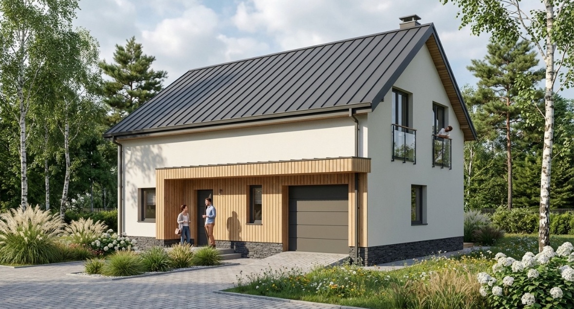 Projekt wyróżnia nowoczesna bryła, duże przeszklenia i funkcjonalny układ pomieszczeń, który zapewnia komfort całej rodzinie.