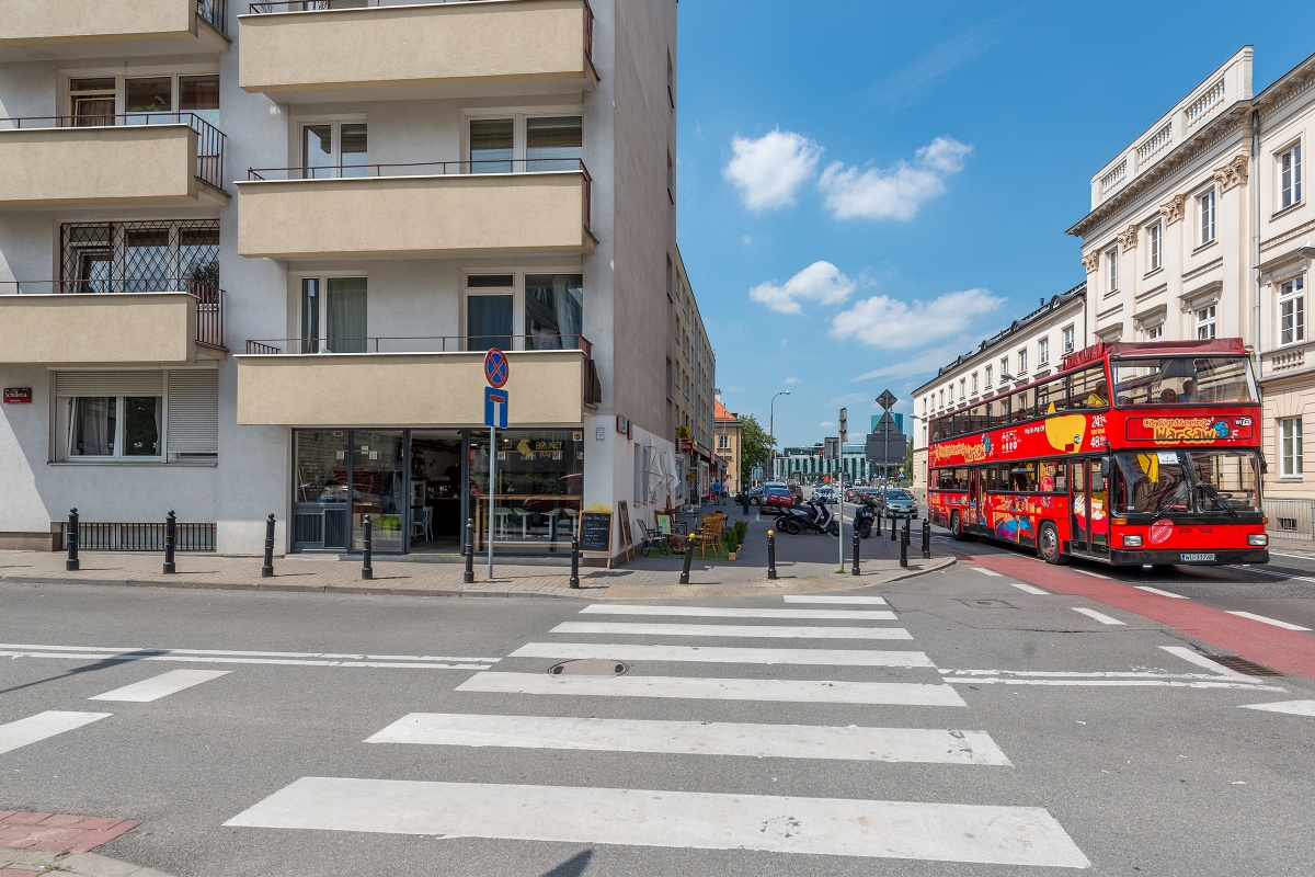Doskonała lokalizacja, pięć minut spacerem na Rynek Starego Miasta, kilka minut pieszo do placu Bankowego i stacji metra Ratusz, minuta do przystanku autobusowego na Miodowej.