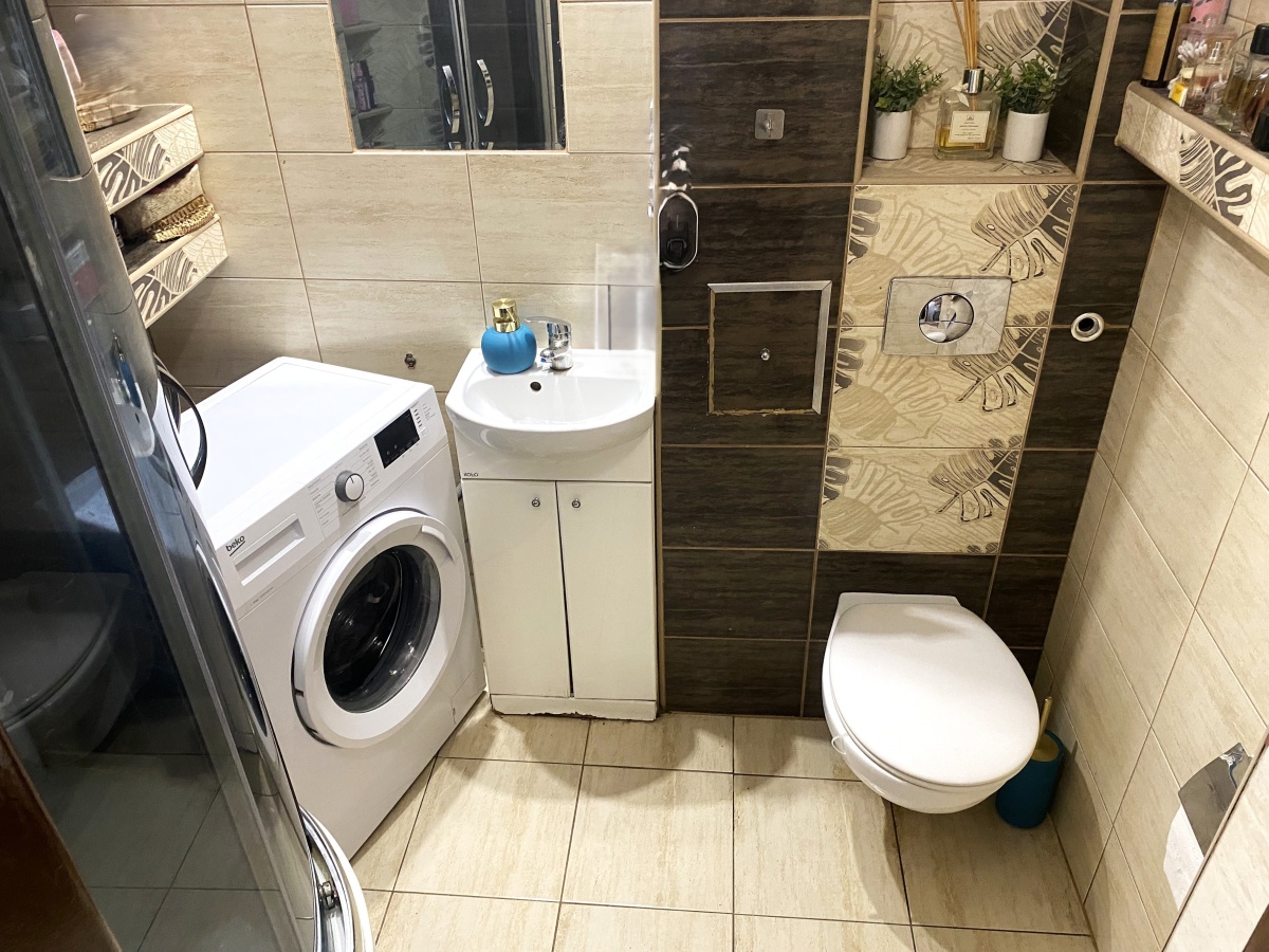 3) Łazienka z WC o powierzchni 2,80m2 w płytkach . Na wyposażeniu prysznic oraz pralka