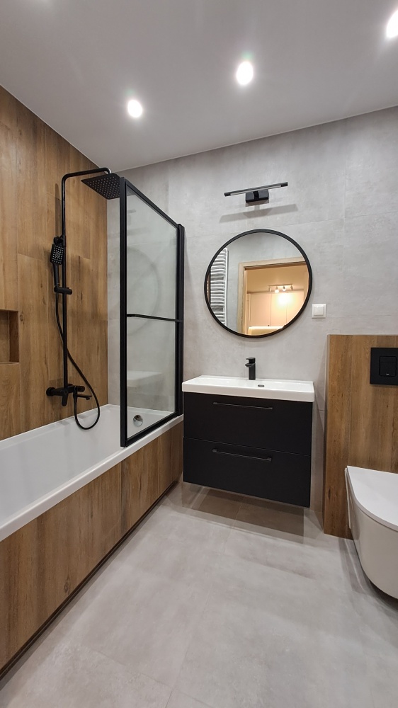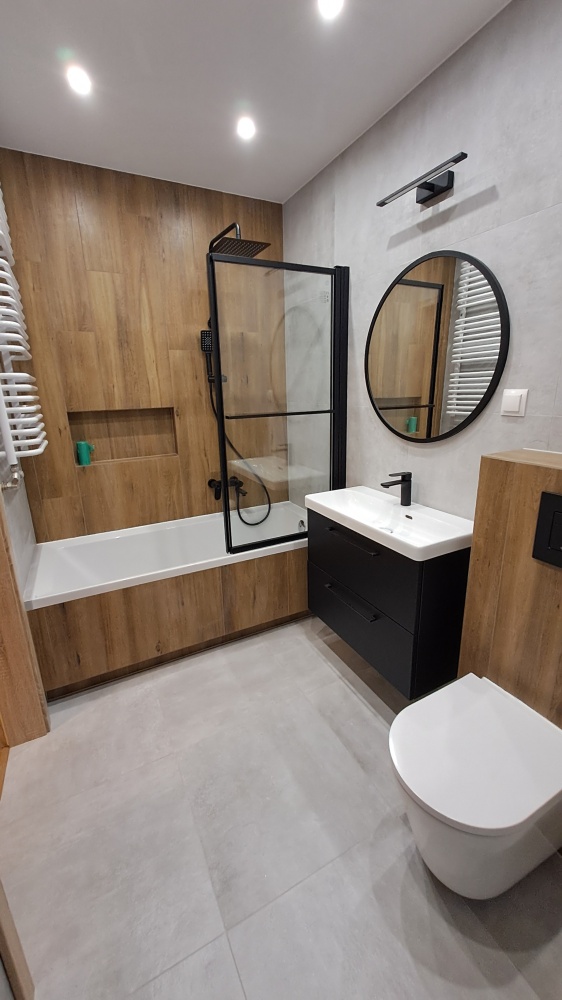 Podwieszany sufit w łazience. Podłoga z paneli winylowych.